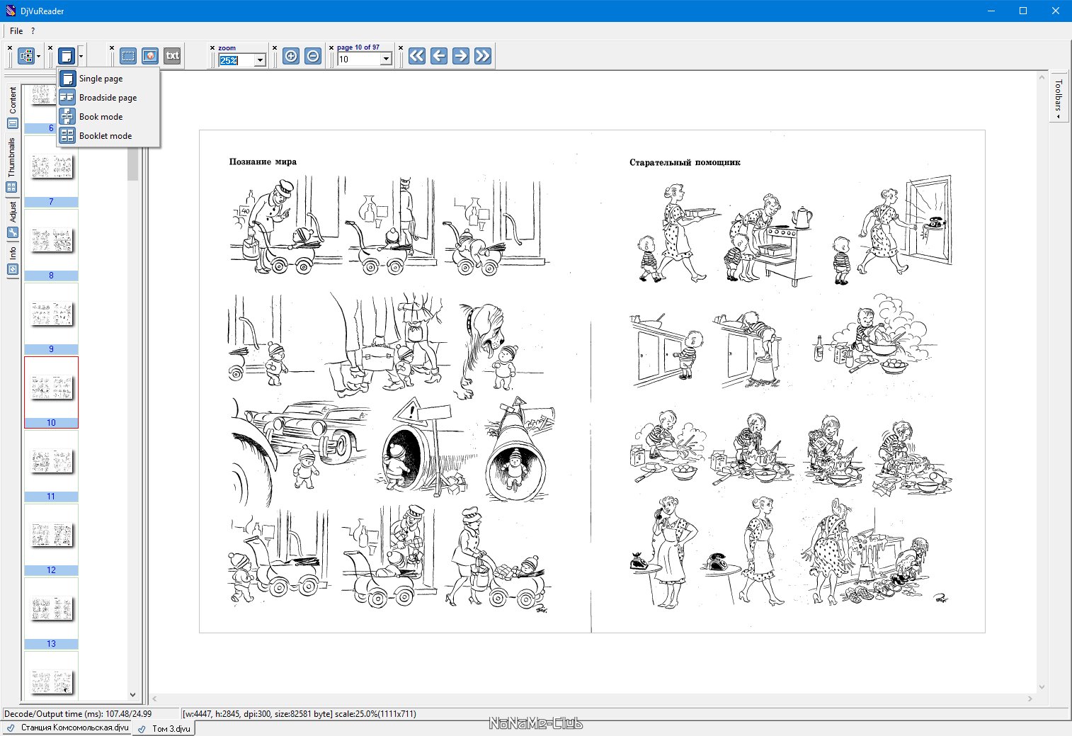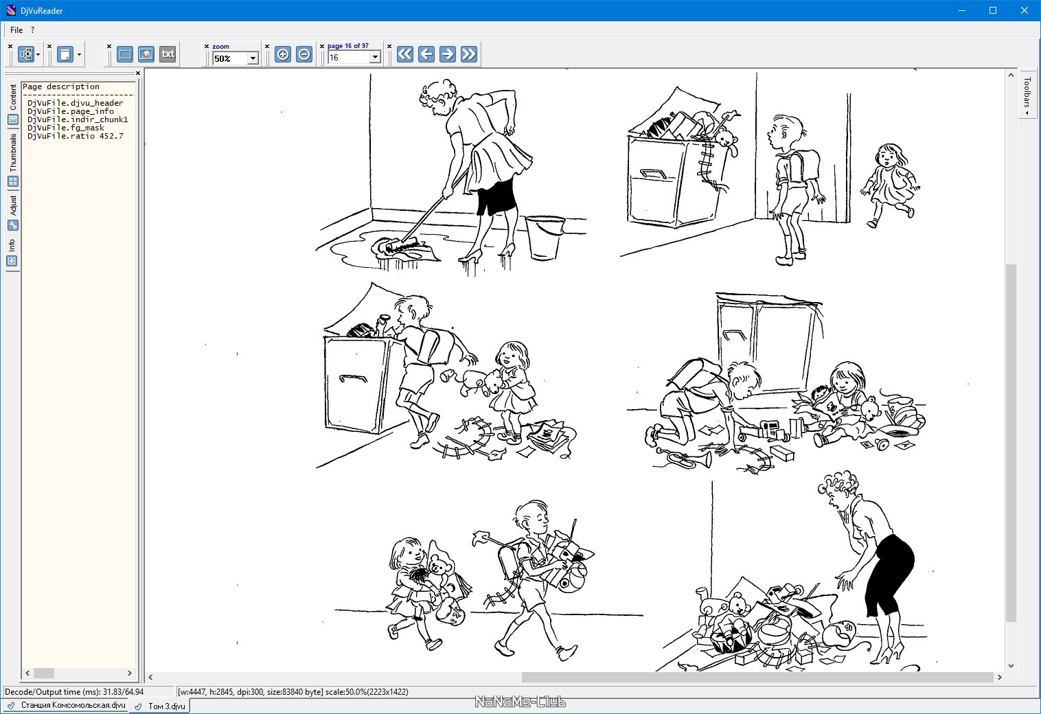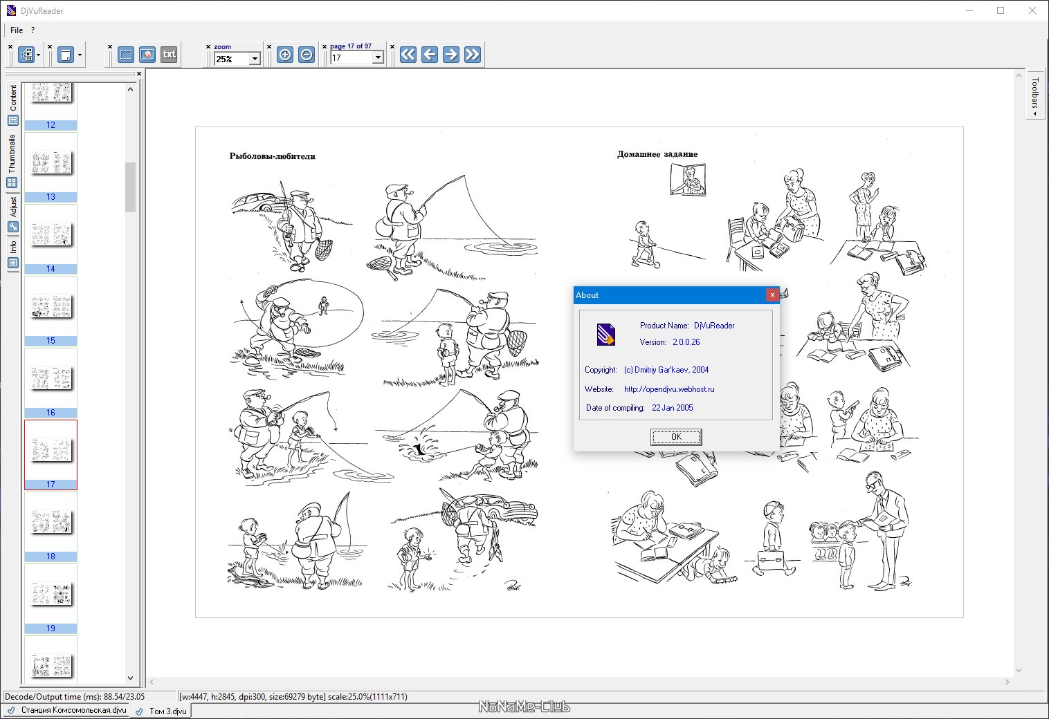 Описание:DjVuReader - программа для просмотра файлов в формате djvu (электронные книги). Поддерживает просмотр в одно- и двухстраничном режимах, имеется возможность настройки яркости и контрастности изображения, поддерживает индексы страниц и содержание, присутствует возможность копирования текста и картинок в буфер обмена, удобная навигация как с клавиатуры, так и при помощи мышки, полноэкранный режим просмотра. Программа портативна, не требует инсталляциии в систему. Имеет четыре режима просмотра документа: одностраничный, режим альбома, книжный режим и режим буклета. Клавиши управления курсором - фокус ввода на странице: смещение в соответствии с направлением на ArrowScroll точек. фокус ввода на содержании или списке иконок: смещение в соответствии с направлением.