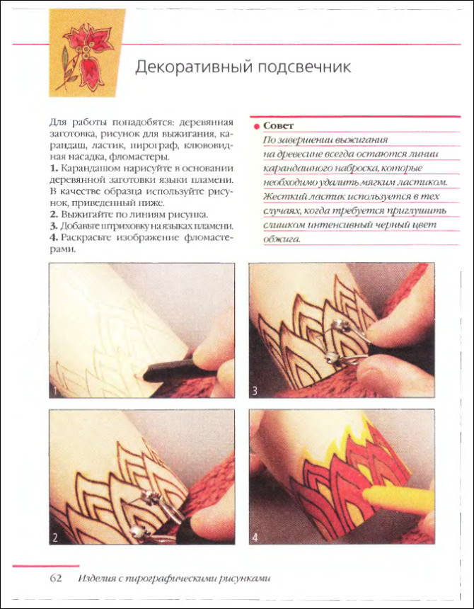 без OCRОписание: Выжиганием по дереву, или пирографией, может заниматься любой человек, даже не имеющий художественного образования. Пирографическое оборудование недорого, просто по устройству и применению. Если вы терпеливы и не лишены фантазии, эта работа вам под силу! В нашей книге рассказывается о всех техниках и приемах, освоив которые вы выполните пирографическую работу любой сложности: от простых, незатейливых узоров до сложных пейзажных композиций. * Родственные релизы: