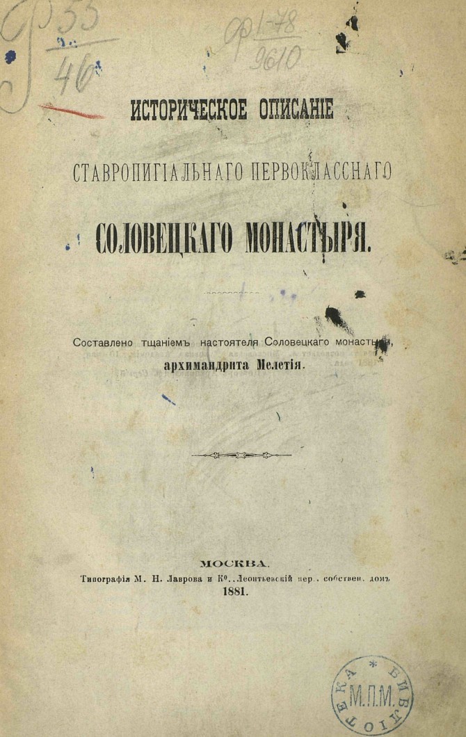 Мелетiй | Историческое описанiе ставропигiальнаго первокласснаго Соловецкаго монастыря (1881) [PDF]