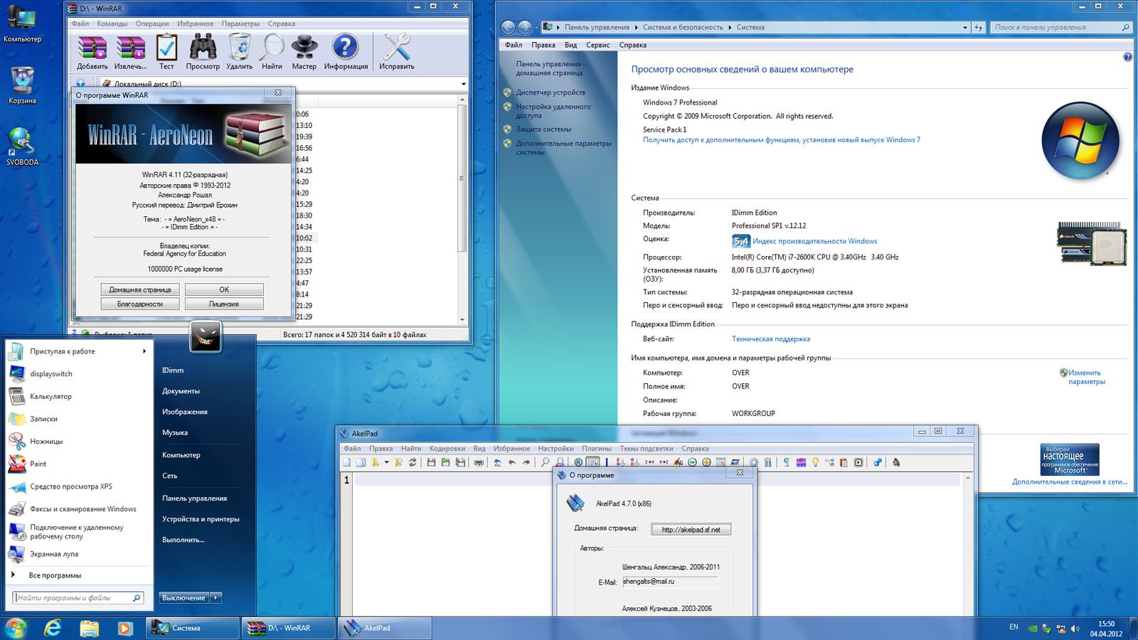 Год выпуска: 2012 Версия: v.6.1.7601.17514/12.12 Разработчик: Microsoft Автор сборки: IDimm Разрядность: 32bit+64bit Платформа: PC Язык интерфейса: русский Таблeтка: oтсутствует Системные требования: • Процессор: 1 GHz, 32-разрядный или 64-разрядный; • Оперативная память: 1 GB (32-bit) / 2 GB (64-bit); • Свободное дисковое пространство: 16 GB (32-bit) / 20 GB (64-bit); • Видеоадаптер: поддержка графики DirectX 9; • 128 MB памяти (для включения темы Aero); • Устройство чтения и записи DVD-дисков / USB Flash.------------------------------------- Описание:• Сборки представлены в виде двух отдельных образов: х86 и х64. • Сборки основаны на официальных образах MICROSOFT MSDN: ru_windows_7_professional_with_sp1_x86_dvd_u_677084.iso ru_windows_7_professional_with_sp1_x64_dvd_u_677024.iso. • Полу-автоматическая установка (оставлена возможность ввести свои данные, • выбрать и отформатировать раздел). • Дистрибутив пропатчен на предмет применения сторонних тем оформления. • Отключены Гибернация и UAC (Контроль учётных записей). • Интегрирован Internet Explorer 9 с последними обновлениями. • Добавлена расширенная памятка для диалога "Выполнить". • Название "Профессиональная" заменено на "Professional". • Интегрированы следующие программы: ..... DirectX ( Июнь 2010 ) ..... Akelpad v.4.7.0 ( моя сборка) ..... WinRAR v.4.11 ( моя сборка) ..... HashTab v.4.0.0.2 ( моя сборка) • Удалены все остальные редакции из образов, для экономии места. • Удалены бесполезные темы, отличающиеся только цветом окна. • Удалены фоновые изображения, примеры картинок, музыки и видео. • Добавлены свои обои на рабочий стол, с удалением оригинальных. • Добавлены свои иконки пользователя, с удалением оригинальных. • Заменены некоторые ресурсы (картинки, иконки). • Применены твики для улучшения интерфейса и быстродействия системы. Скриншоты: