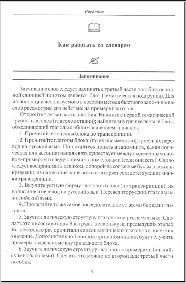 Описание: Пособие представляет собой словарь-минимум, содержащий более 3300 слов, необходимых для общения на английском языке по общим темам. Словарь содержит оригинальную методику ускоренного запоминания английских слов, в основе которой лежит логическое кодирование — деление слов внутри частей речи на группы, объединенные общим понятием или ассоциацией, и присвоение им названий-кодов, позволяющих легко отыскать нужное слово в памяти и быстро "прокрутить" в памяти весь словарь. Словарь-минимум рассчитан на старшие классы средних школ и широкий круг лиц, изучающих английский язык самостоятельно и стремящихся углубить и систематизировать знание лексики английского языка.