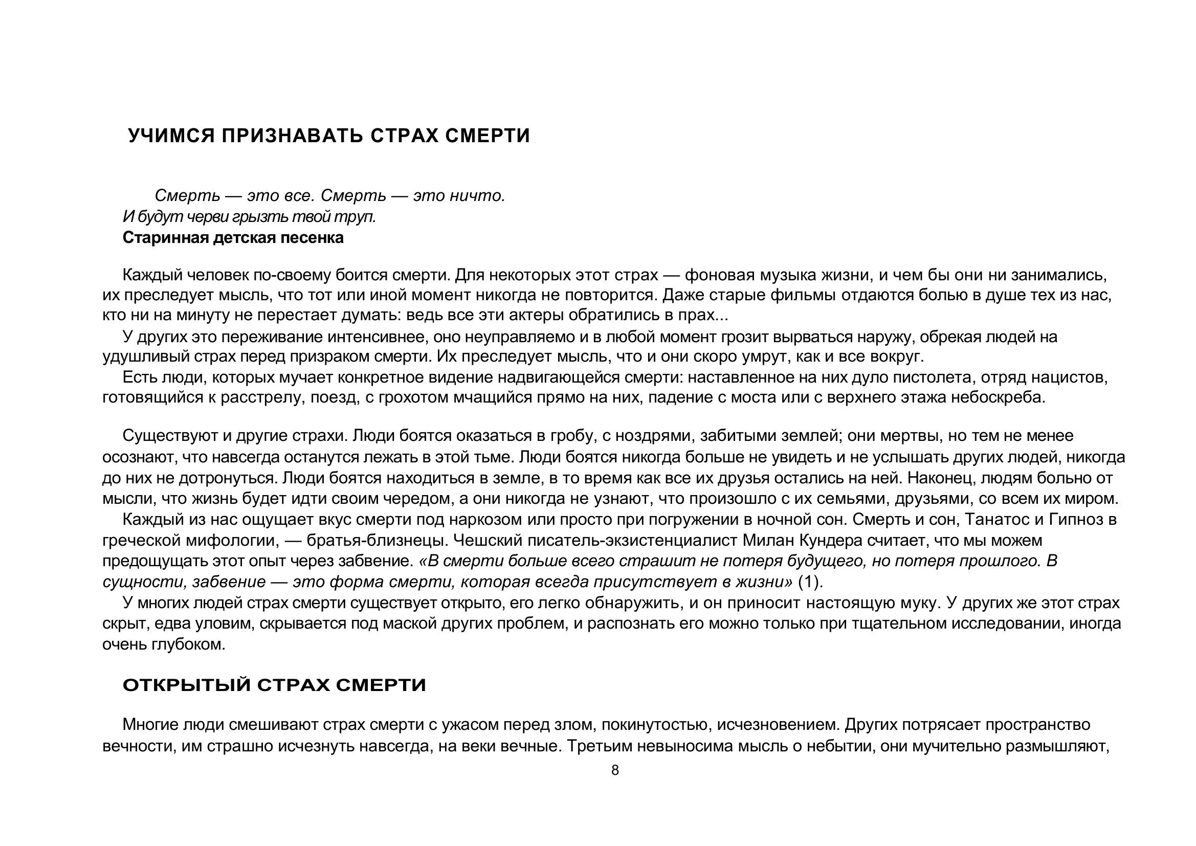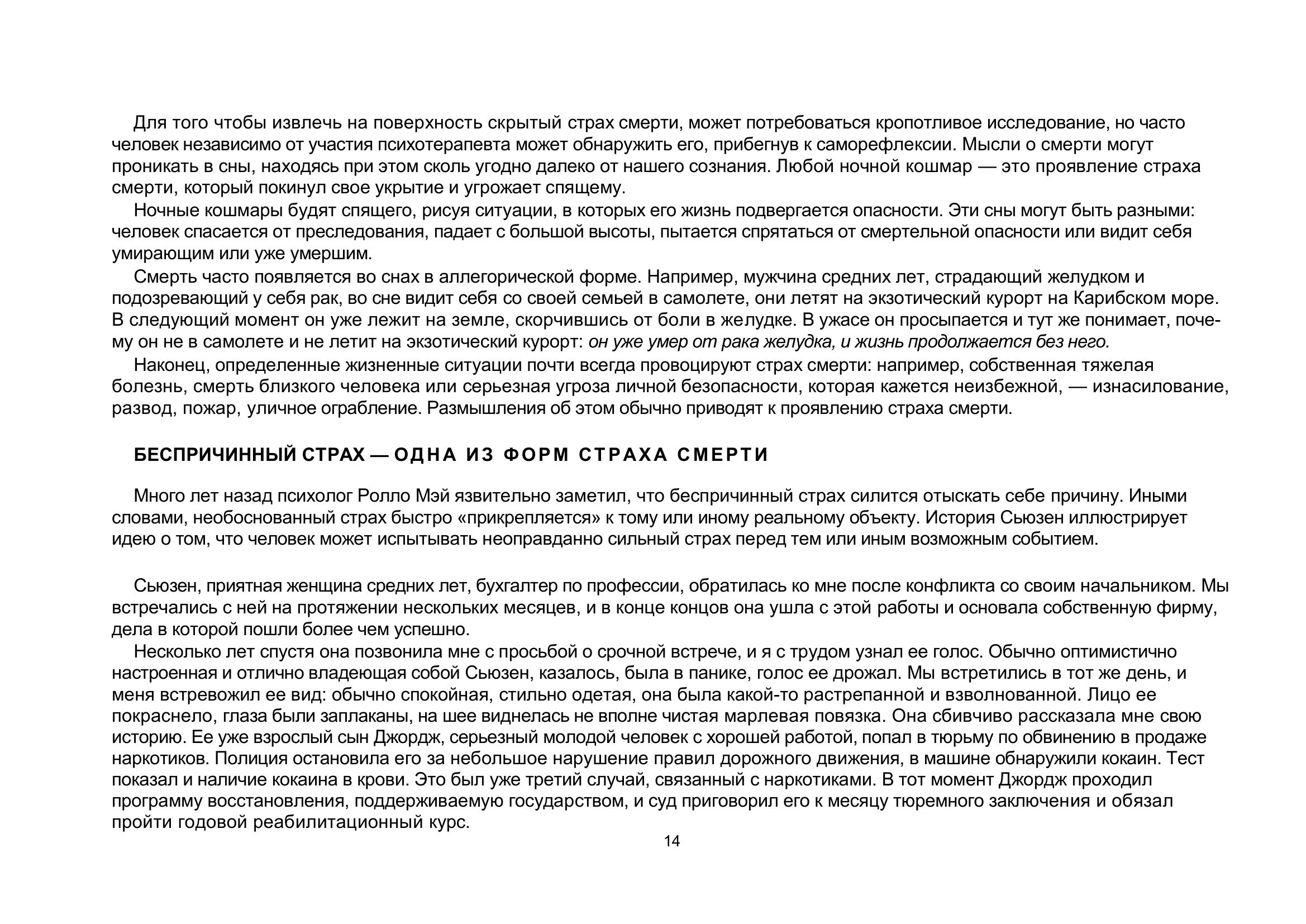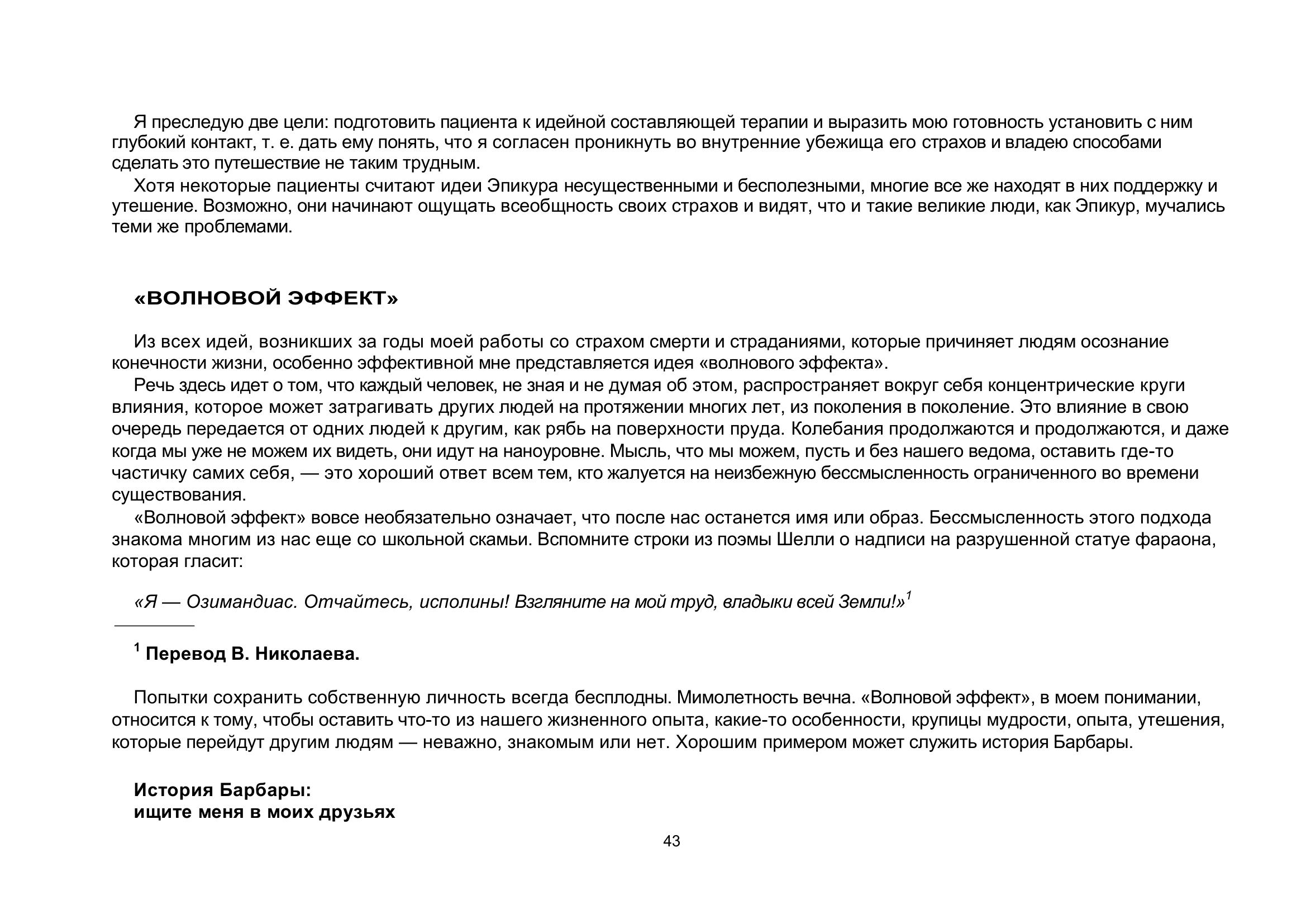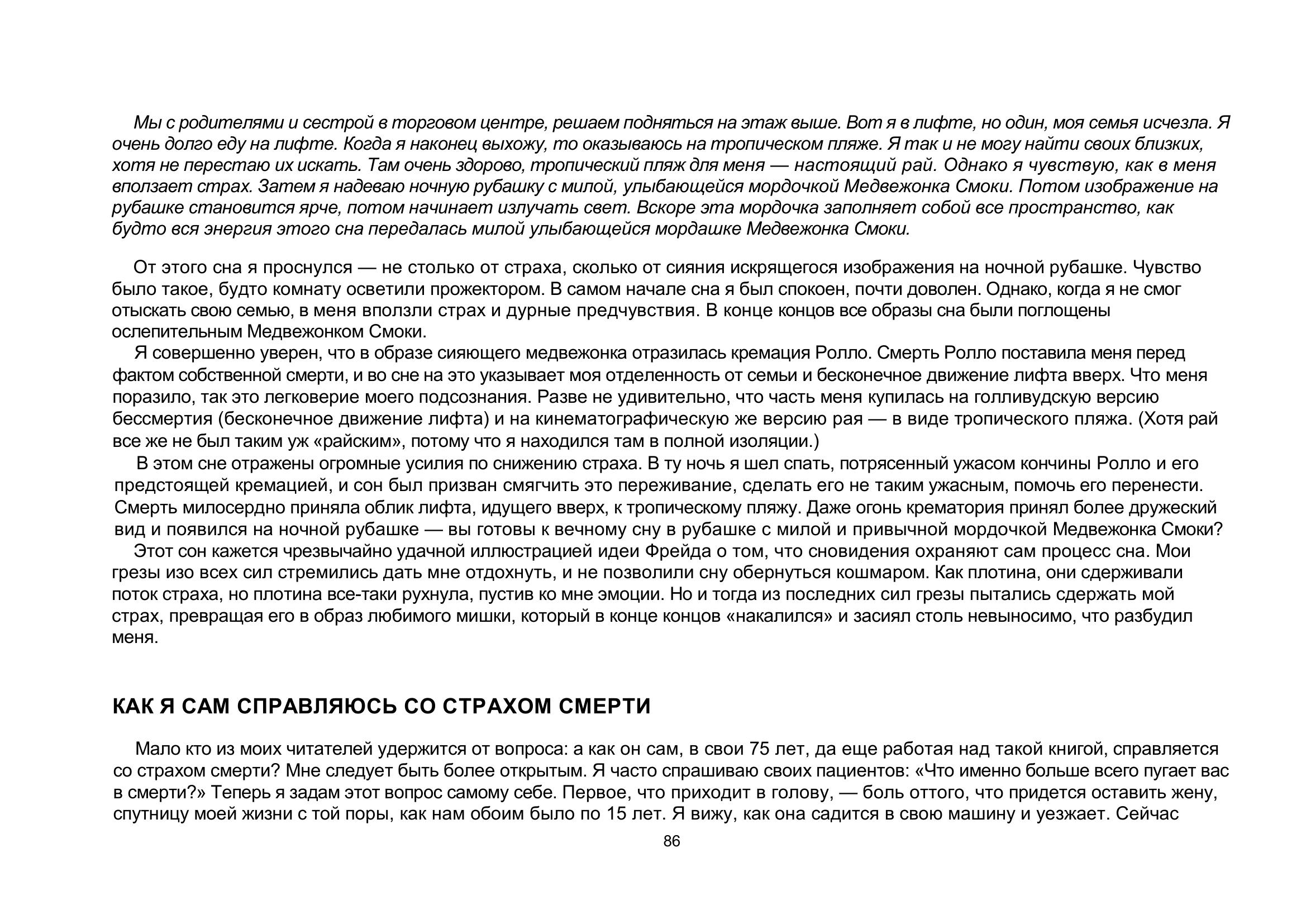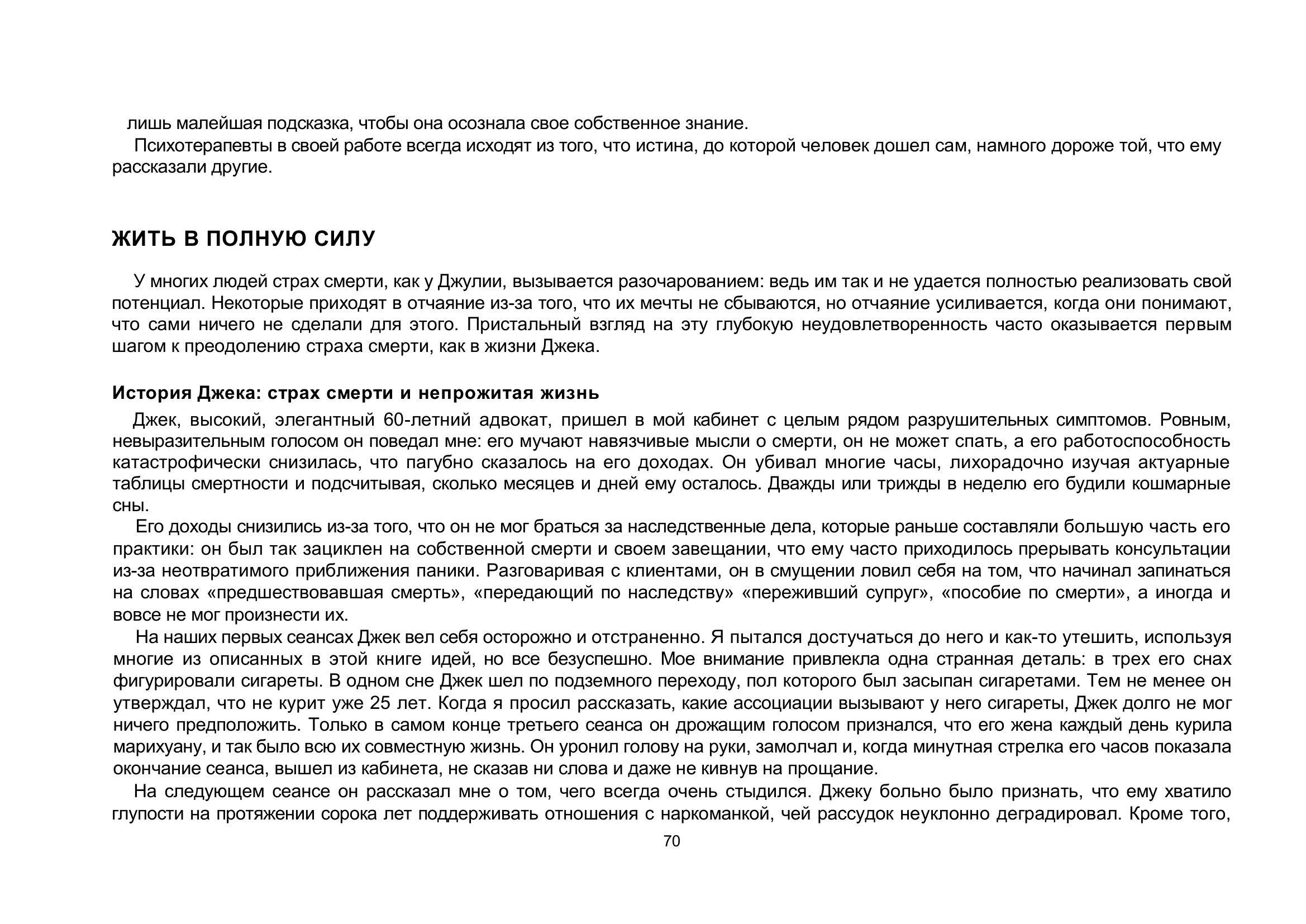 Теперь у вас в руках очень действенный инструмент борьбы со страхом смерти. Эта книга учит понять и принять условия человеческого существования и сполна наслаждаться каждой минутой жизни. При всей серьезности темы книга захватывает и увлекает благодаря мастерству великолепного рассказчика — доктора Ирвина Ялома.