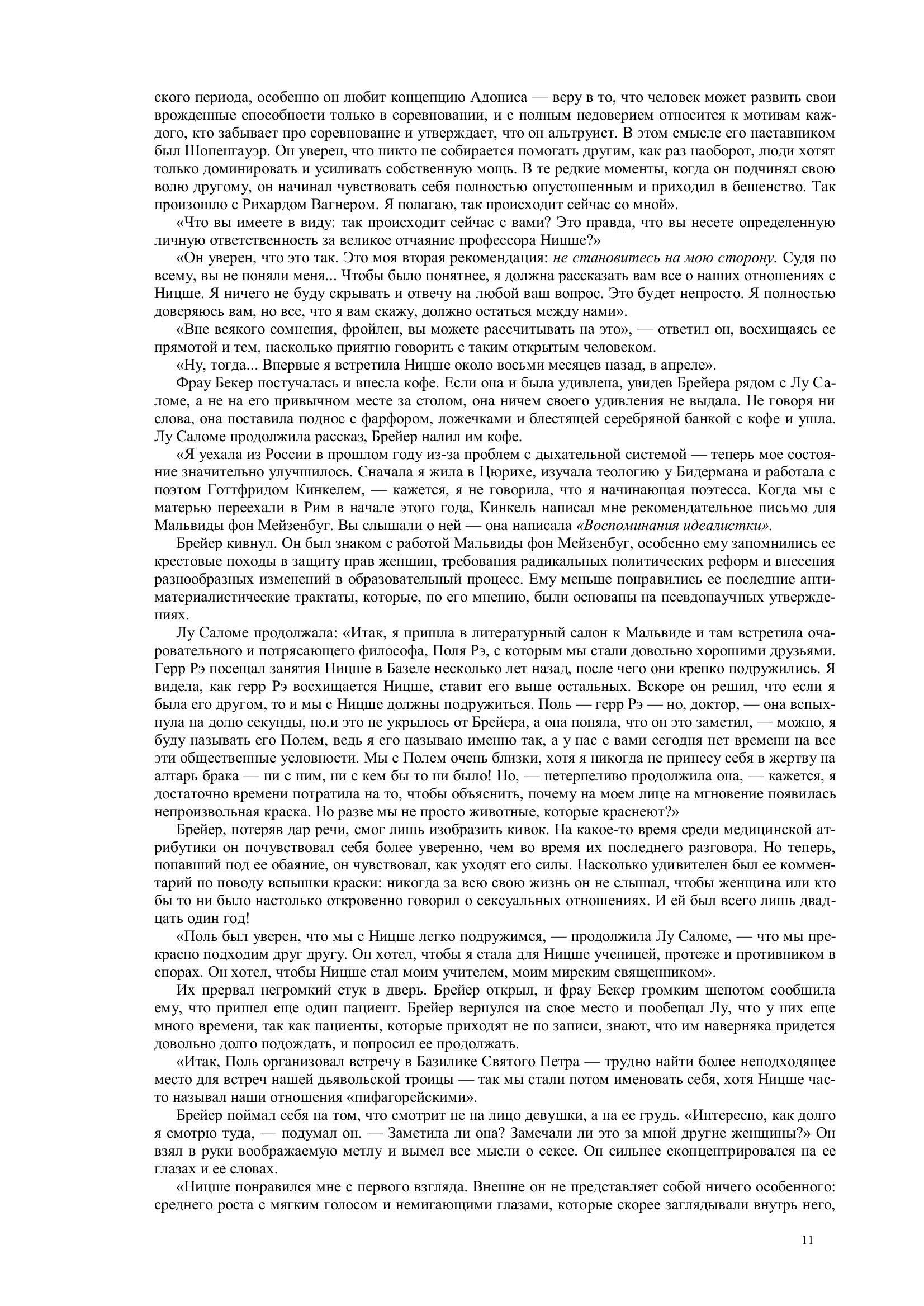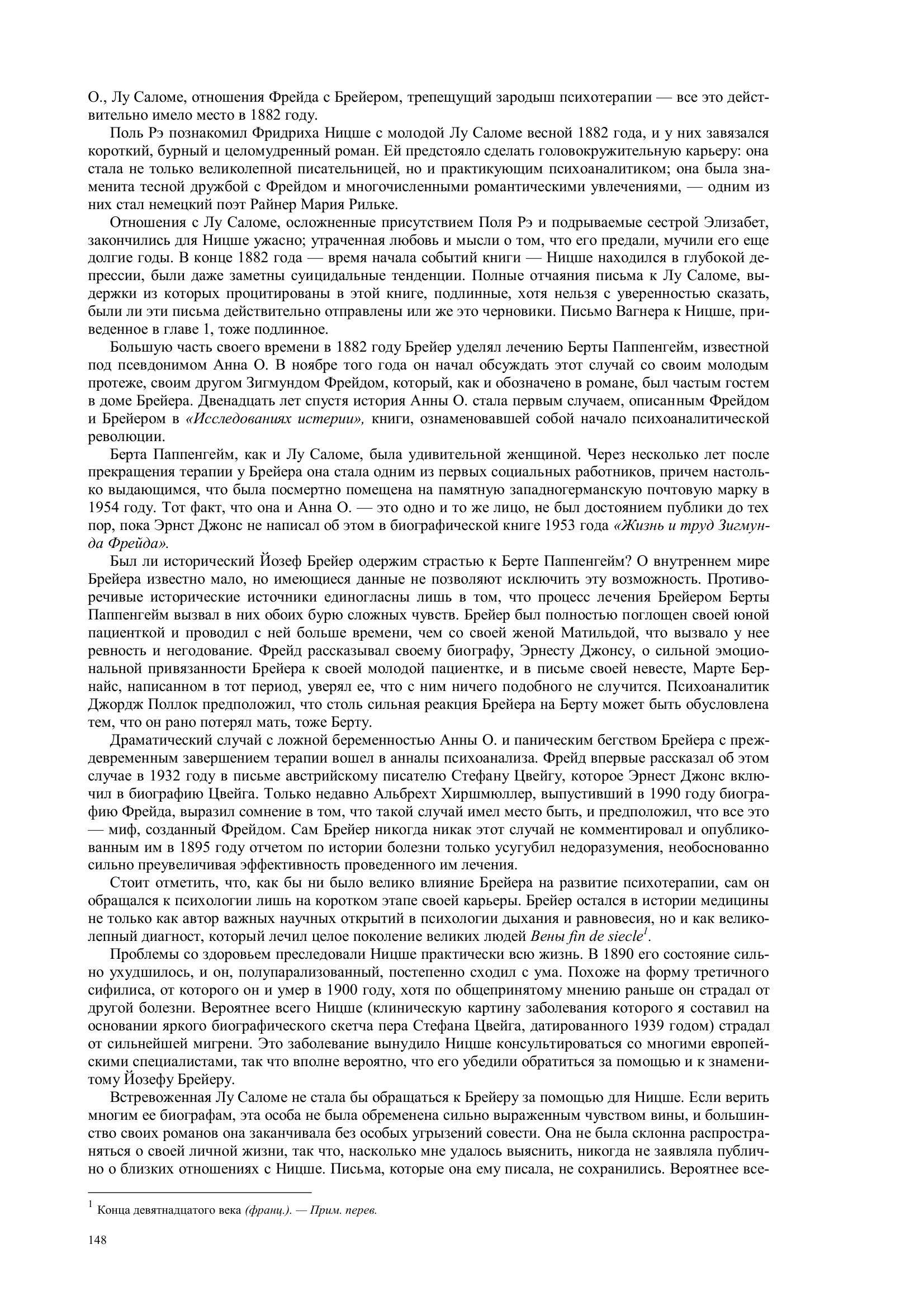 Ялом втягивает в действие не только Ницше и Брейера, но и Лу Саломе, «Анну О.» и молодого ме-дика-интерна Зигмунда Фрейда.