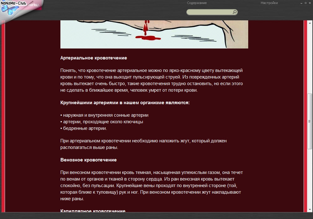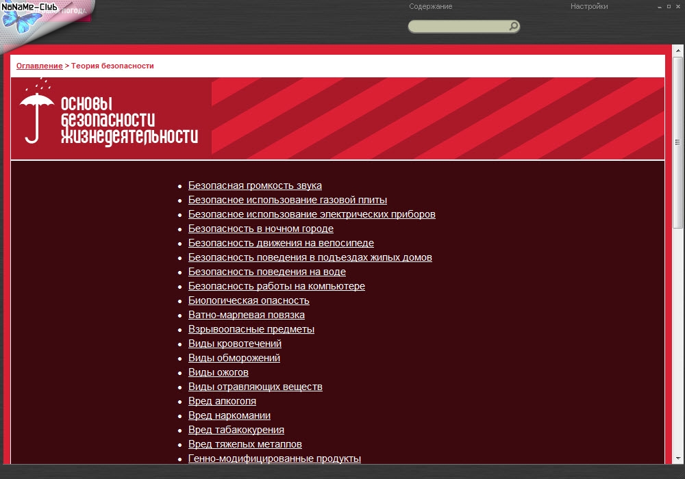 Особую ценность представляет раздел, содержащий практическое руководство по поведению в экстремальных ситуациях: при аварии в транспорте, при нападении животных, при ограблении, при пожаре, урагане, наводнении, землетрясении, в толпе, при террористической угрозе и т.д. Всего представлено 50 опасных ситуаций, более 50 болезней, более 30 видов оказания медицинской помощи другому человеку, более 50 теоретических вопросов и многое другое.
