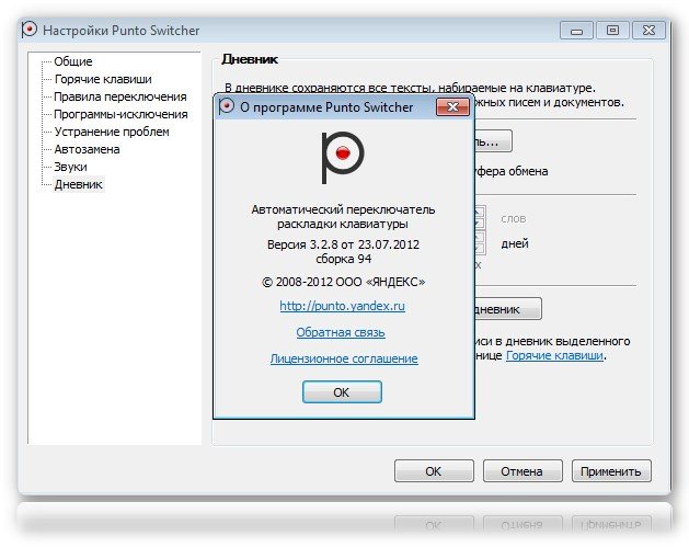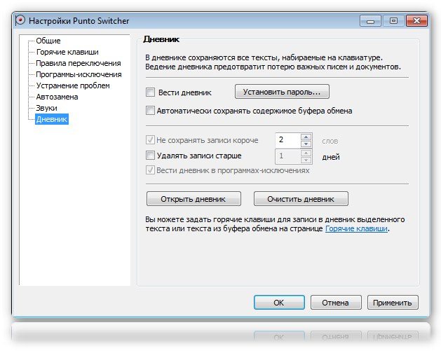 В программу Punto Switcher входит дневник — Punto Diary. Дневник разработан, чтобы помочь вам сохранить и упорядочить осмысленный текст, который обычно распыляется по конференциям, письмам, чатам. В Punto Dairy есть возможность поиска по всему тексту, который человек набирал в течение недели, месяца, года. Журналист из этого может сделать статью, писатель — книгу, а можно, листая дневник, вспомнить, что вы делали прошлой весной. Punto Diary может быть полезен для цитирования забытого разговора в чате, восстановления текста после сбоя программы и т.д.