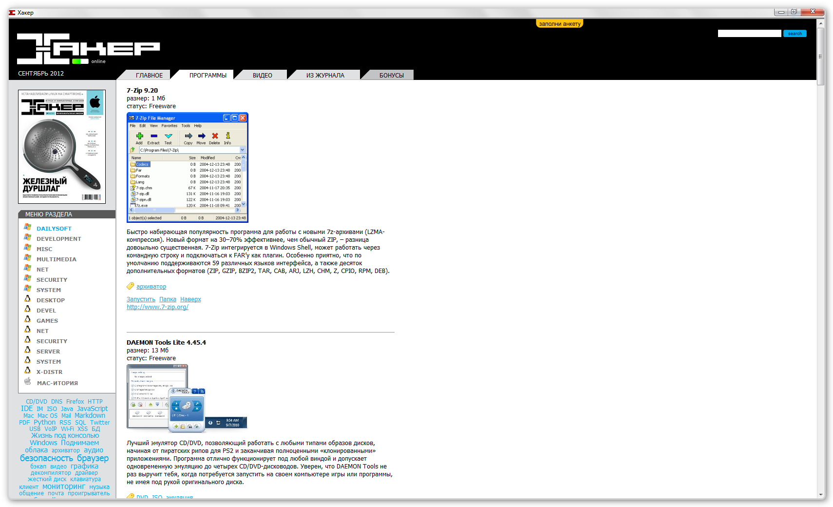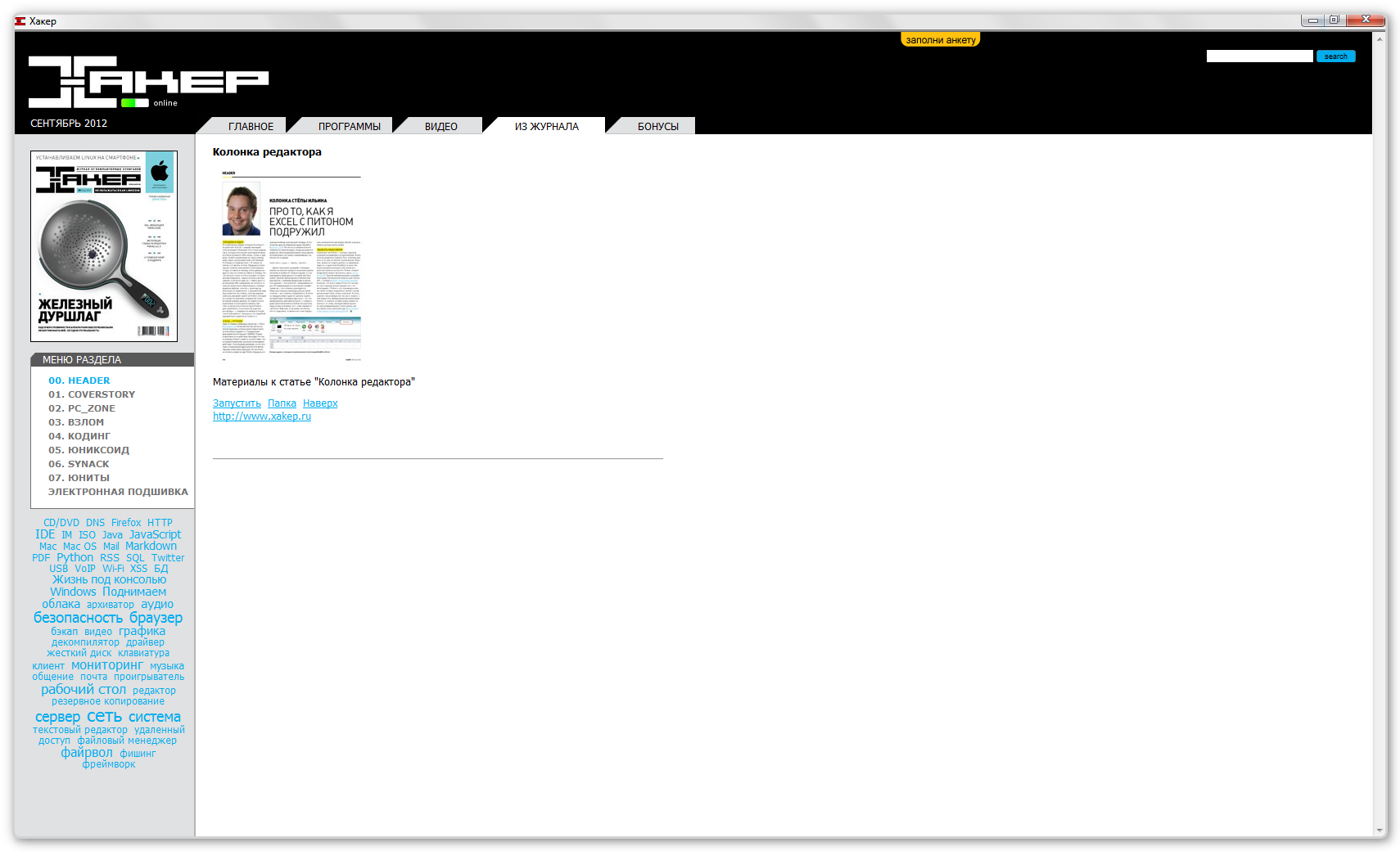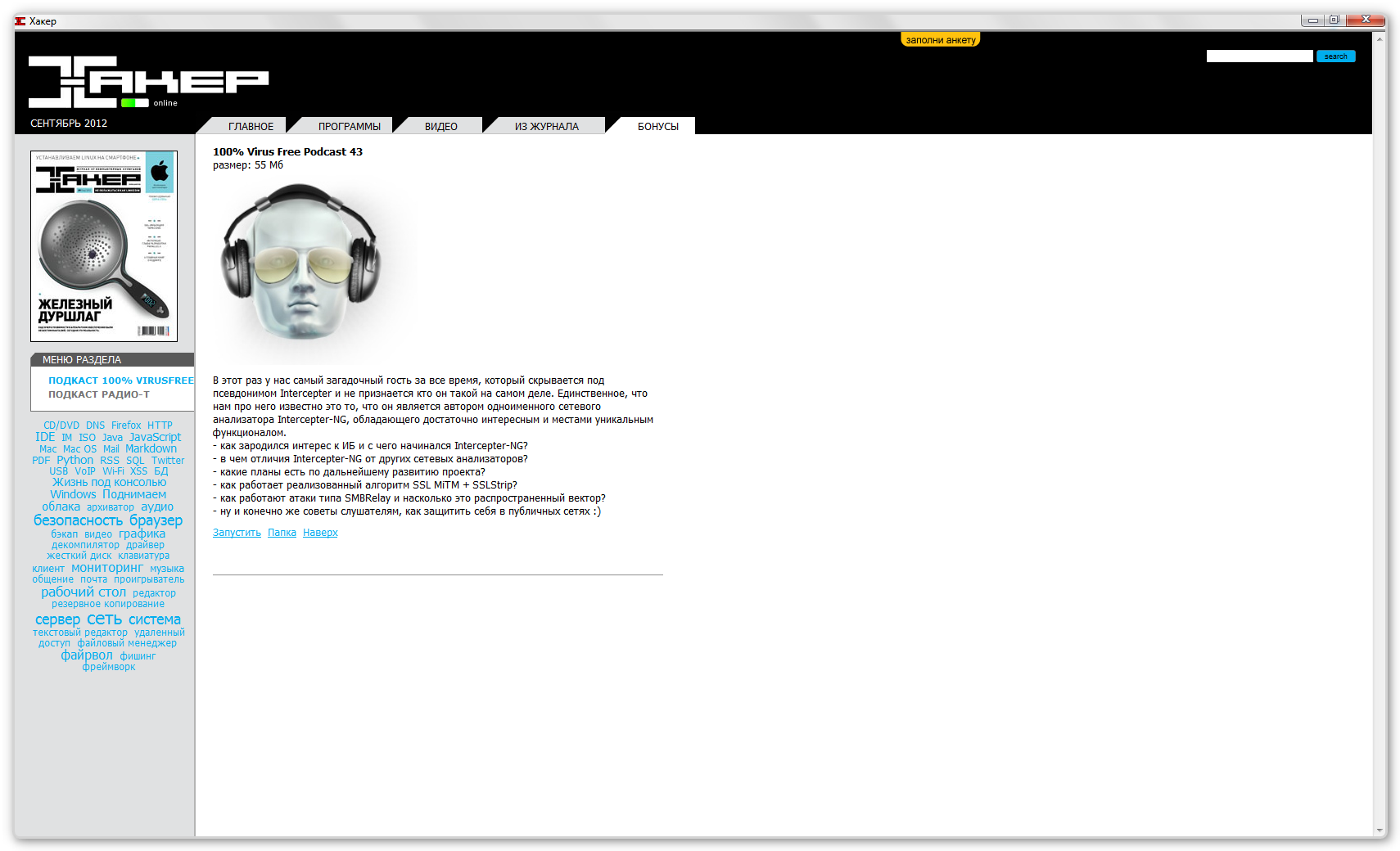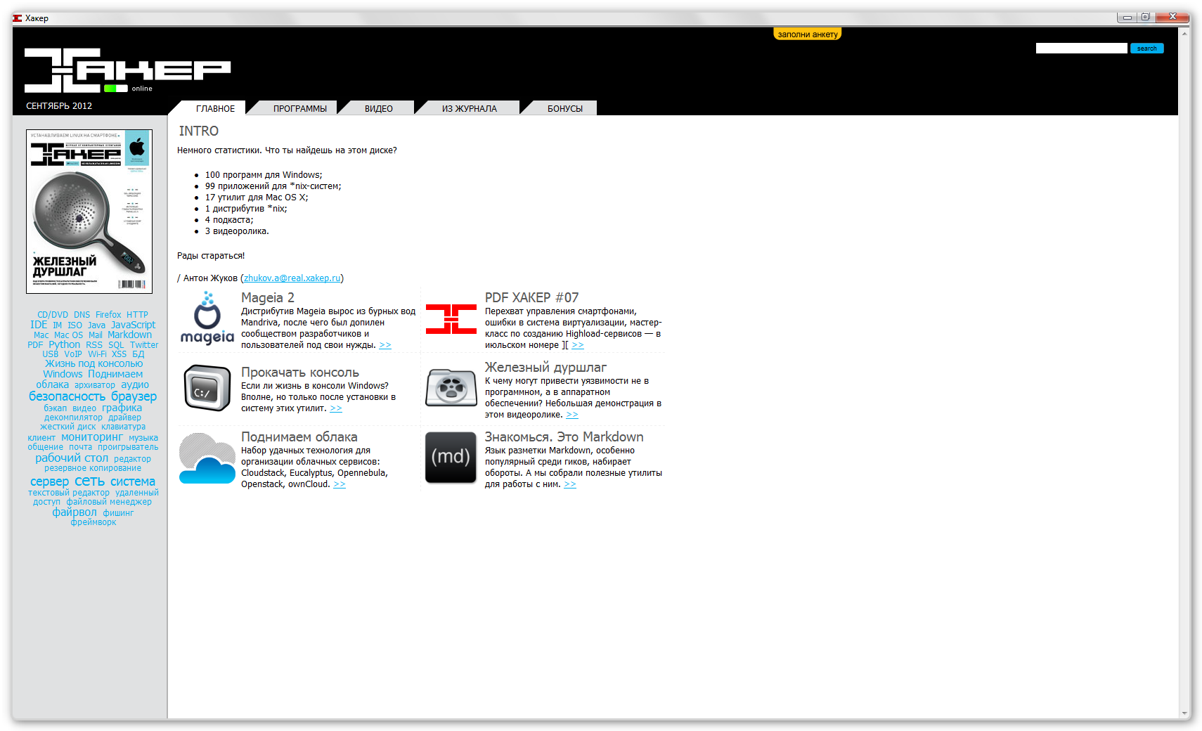 Название Программы: Приложение к журналу Хакер № 9 Версия программы: (164) 2012 Адрес официального сайта: http://dvd.xakep.ru Язык интерфейса: Русский Формат: DVD 9, unpacked Интерактивное оглавление: Да