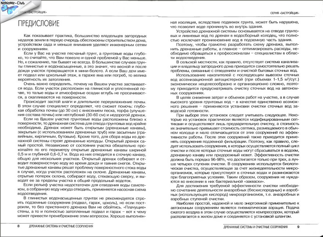Рассматриваются вопросы устройства дренажных систем в зависимости от свойств грунта, очистных сооружений, а также необходимое для их функционирования оборудование. Практическое справочное пособие для широкого круга заинтересованных данными вопросами читателей и владельцев загородных наделов земли.Скриншоты: