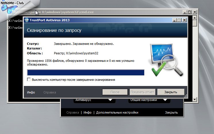 TrustPort LiveCD использует движок AVG для проверки системы. Доступна быстрая проверка критических для безопасности областей системы, проверка всех дисков, локальных дисков, сменных носителей, реестра и заданной области.