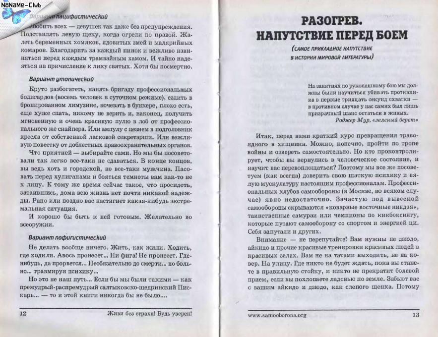 Автор: М.Степанов, О.Майоров Название: Как выжить в городских джунглях, или Самооборона для непосвященных Год: 2006 Издательство: Феникс Отрасль (жанр): Самооборона Формат: PDF Качество: Удовлетворительный скан Описание: Аннотация: Эта книга для тех, кто боится, панически (и не очень) боится, вплоть до того, что боится признаться себе в этом самому. Страх естественное чувство, но иногда он становится липким и навязчивым, превращаясь в проблему, которую нужно решить. Решить и противопоставить страху свою уверенность. А уверенность не возникает из ниоткуда. По-нашему мнению, уверенность - это Вера с Опытом, прошедшая различные трудности и испытания и не потерявшая своей детской непосредственности. Испытаний в жизни хватает, нужно только принимать эти препятствия как тренировки, в которых крепнет наша вера, превращается в непоколебимую уверенность. Уверенность в своих силах и способностях! Мы считаем, что книга должна побуждать к действию, указать путь, по которому можно двигаться к своей цели. Надеемся, что книга окажется призывом к действию и активному образу жизни!Скриншоты: