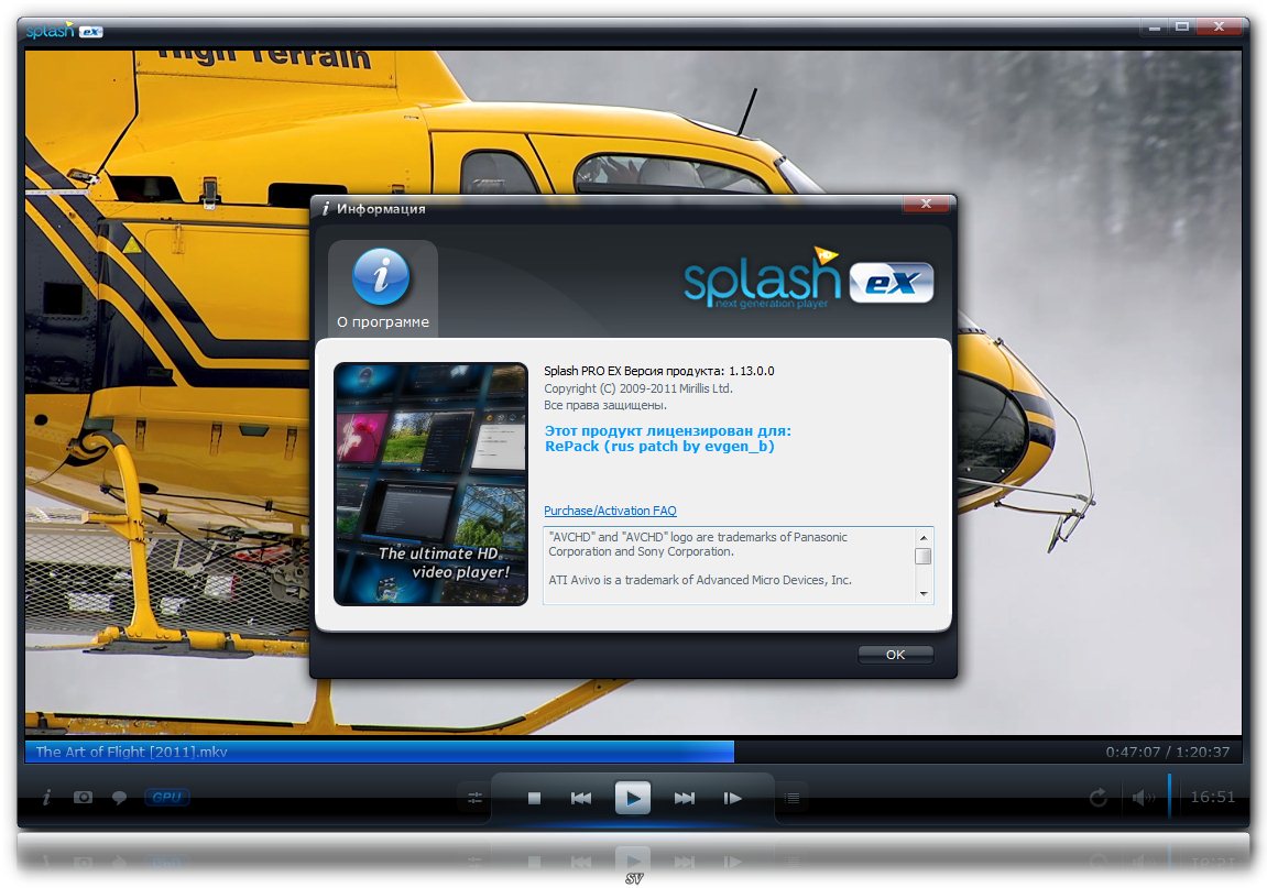 Описание: Splash PRO - оптимизированный для проигрывания видео в высоком разрешении (High Definition AVC/H.264) и просмотра цифровых телевизионных каналов (DVB-T). Splash Player имеет встроенный кодек Mirillis AVC/H.264, который является собственной разработкой компании, и способен обеспечить высококачественное четкое и гладкое изображение в высоком разрешении. Плеер отличается стильным, удобным интерфейсом. - Разработан и оптимизирован для HD видео!