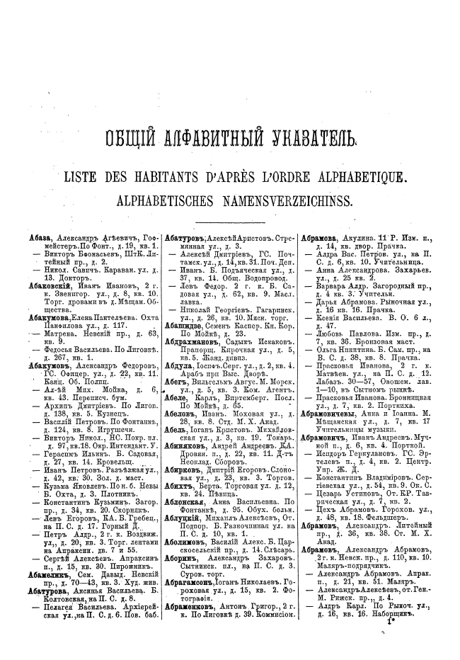 Описание:Справочник, предлагаемый в раздаче, представляет собой адресную книгу, состоящую из пяти отделений, и издание которой растянулось на два года. Первое отделение посвящено лицам, состоящим на государственной службе, сведения даны по министерствам. Второе отделение описывает местные "присутственные" места. благотворительные заведения, акционерные и торговые общества, компании, товарищества, купеческие конторы и т.п. Третье отделение содержит общий алфавитный указатель жителей столицы. Четвертое отделение также содержит указатель, но указатель лиц, занимающихся ремеслом или иными занятиями. Пятое, последнее отделение, содержит список домовладельцев Петербурга с обозначением улиц и участков. Книга, конечно, не имеет практического значения в своем основном назначении, но она является ценным источником сведений по истории Санкт-Петербурга и его жителям того времени.