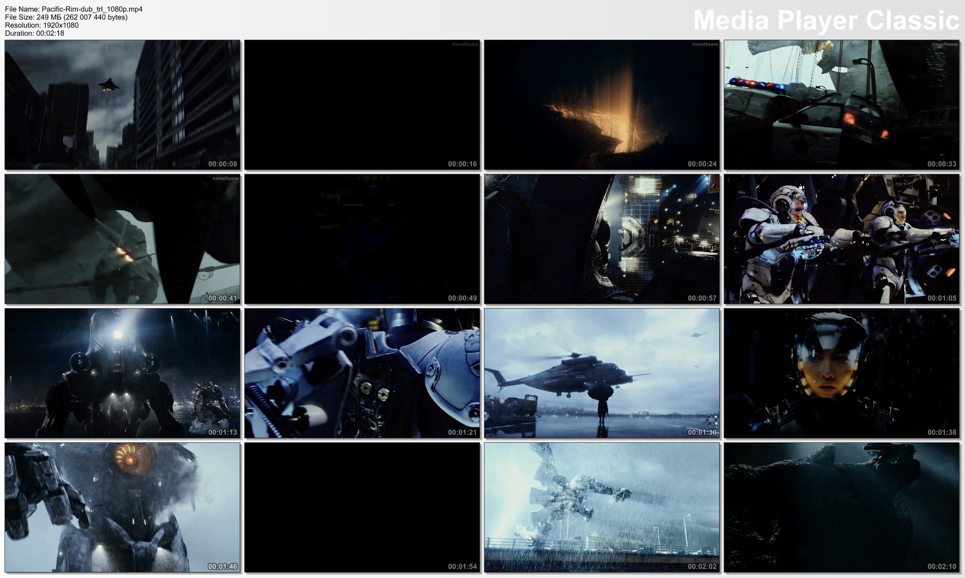 General Complete name : E:\Pacific-Rim-dub_trl_1080p.mp4 Format : MPEG-4 Format profile : Base Media / Version 2 Codec ID : mp42 File size : 250 MiB Duration : 2mn 18s Overall bit rate mode : Constant Overall bit rate : 15.1 Mbps Encoded date : UTC 2012-12-14 07:39:41 Tagged date : UTC 2012-12-14 07:42:05