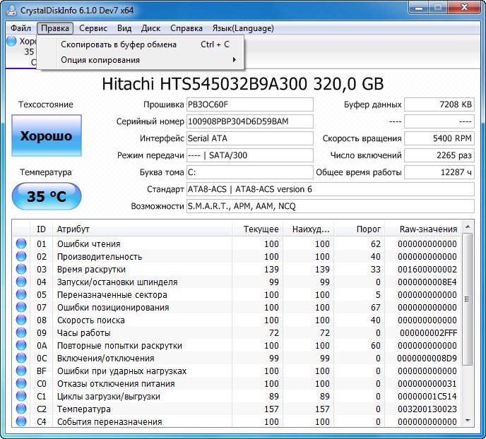 Описание:CrystalDiskInfo - отслеживает состояние жестких дисков, поддерживающих технологию S.M.A.R.T. Производит мониторинг и дает общую оценку "здоровья" вашего диска. Отображает детальную информацию о жестких дисках, установленных в компьютере (прошивка, серийный номер, стандарт, интерфейс, общее время работы и др.). Выводит параметры атрибутов системы самодиагностики S.M.A.R.T. (ошибки чтения, производительность, запуски/остановки шпинделя, время поиска дорожки, количество циклов включения-выключения, ошибки секторов и многое другое). Программа поддерживает локализации, сменные темы, динамически отслеживает изменения параметров для всех накопителей в системе и позволяет отображать это на графике. Присутствует поддержка для внешних накопителей с интерфейсами USB и IEEE 1394. Полный перечень поддерживаемых чипов и контроллеров можно найти на официальном сайте (подробнее). Реализована возможность управления AAM и APM для внешних устройств.