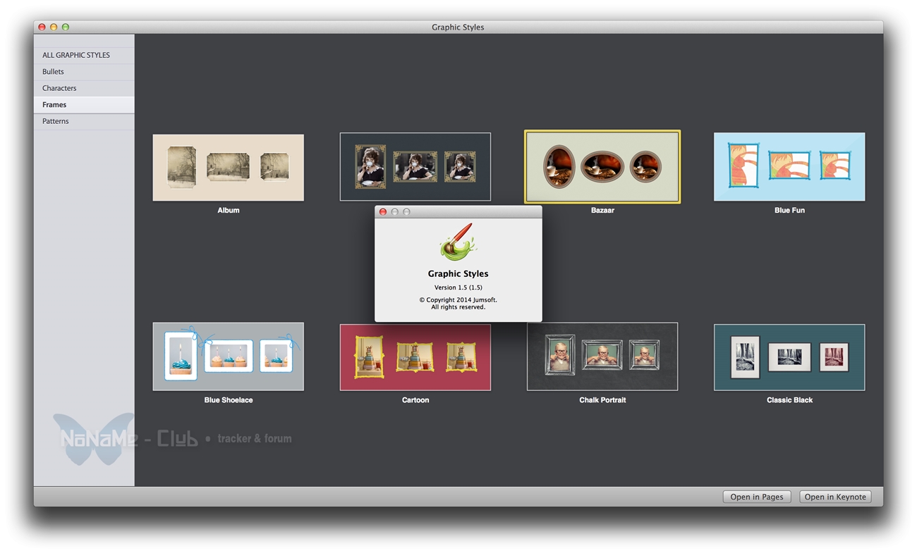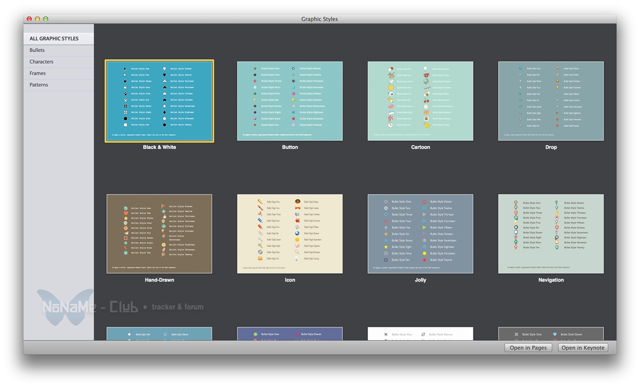 *** Requires Keynote 5.0 / Pages 4.0 or later versionsОписание:Graphic Styles содержит набор высококачественных изображений, которые помогут вам создать уникальные презентации в Keynote для иллюстрации ваших слайд-шоу, информационных бюллетеней или любого другого контента. Эта великолепная коллекция придаст вашим презентациям эксклюзивность если включить в неё оригинальные рамки, символы, графический шрифт и т.д.