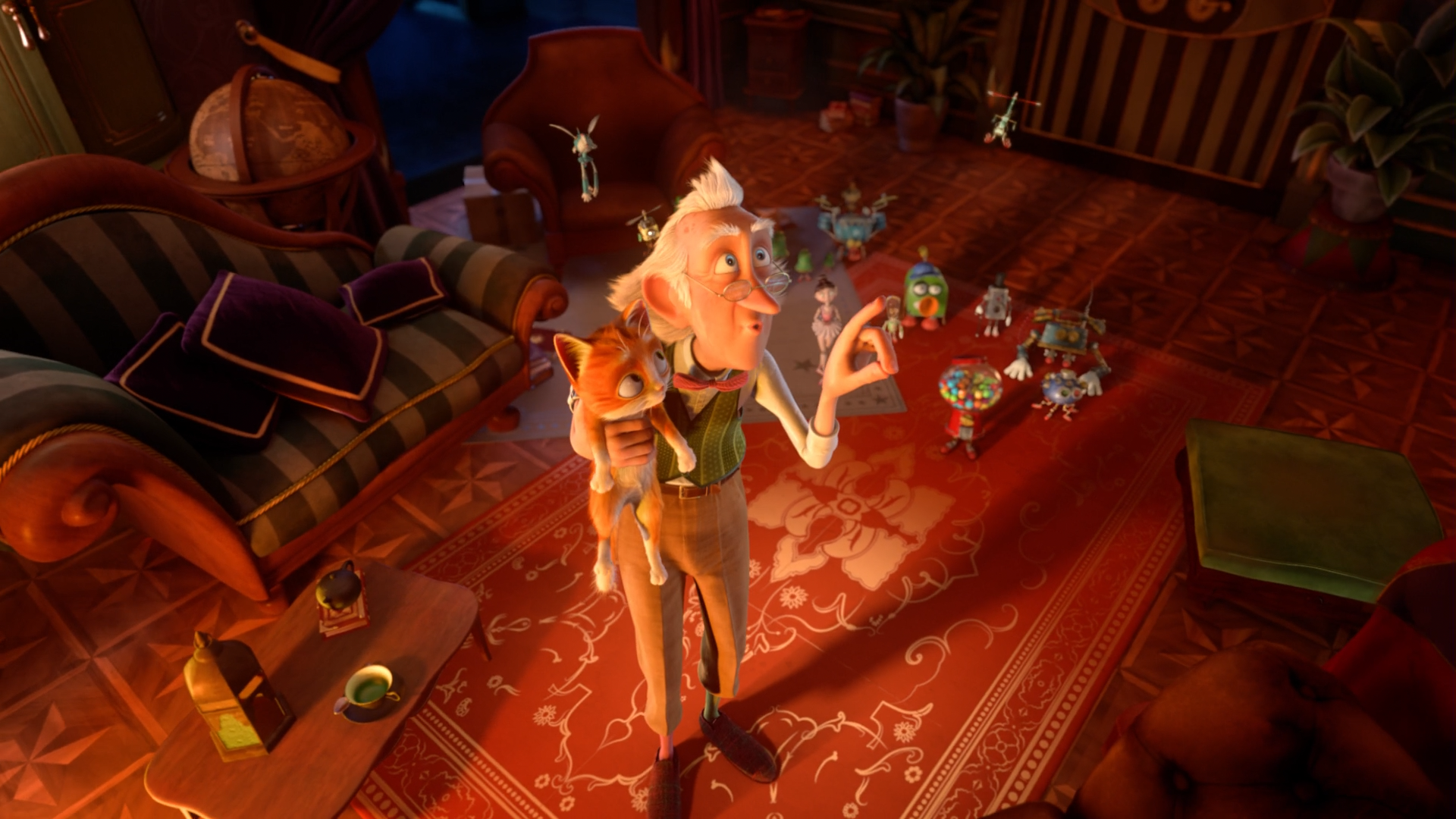 Описание: Любопытный рыжий кот попадает в дом старого фокусника и узнает секрет его трюков. Так начинается его знакомство с учеными зверями и живыми игрушками, а также невероятные приключения полные юмора и опасностей.