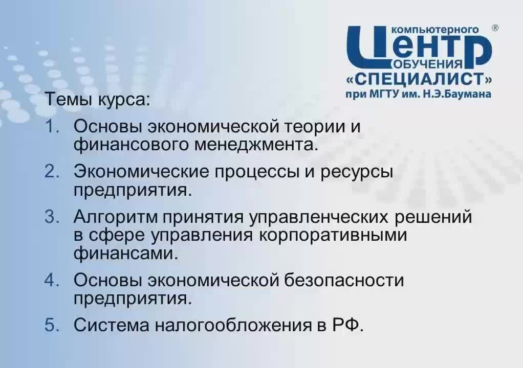 Автор (режиссер): Специалист Жанр: Обучающие видео-уроки Продолжительность: 09:20:50 Качество видео: PCRec Видеокодек: AVC Битрейт видео: ~36,6 - 69,5 kb/s Размер кадра: 670x474 - 1024x722 Аудиокодек: AAC Битрейт аудио: 77,6 kb/s, 2 Ch Описание:По окончании курса Вы будете уметь:понимать терминологию экономистов и ориентироваться в финансовой информации владеть методами финансового анализа рассчитывать налоговую нагрузку использовать результаты финансового анализа при принятии управленческих решений управлять ресурсами и капиталом компании Модуль 1. Основы экономической теории и финансового менеджмента