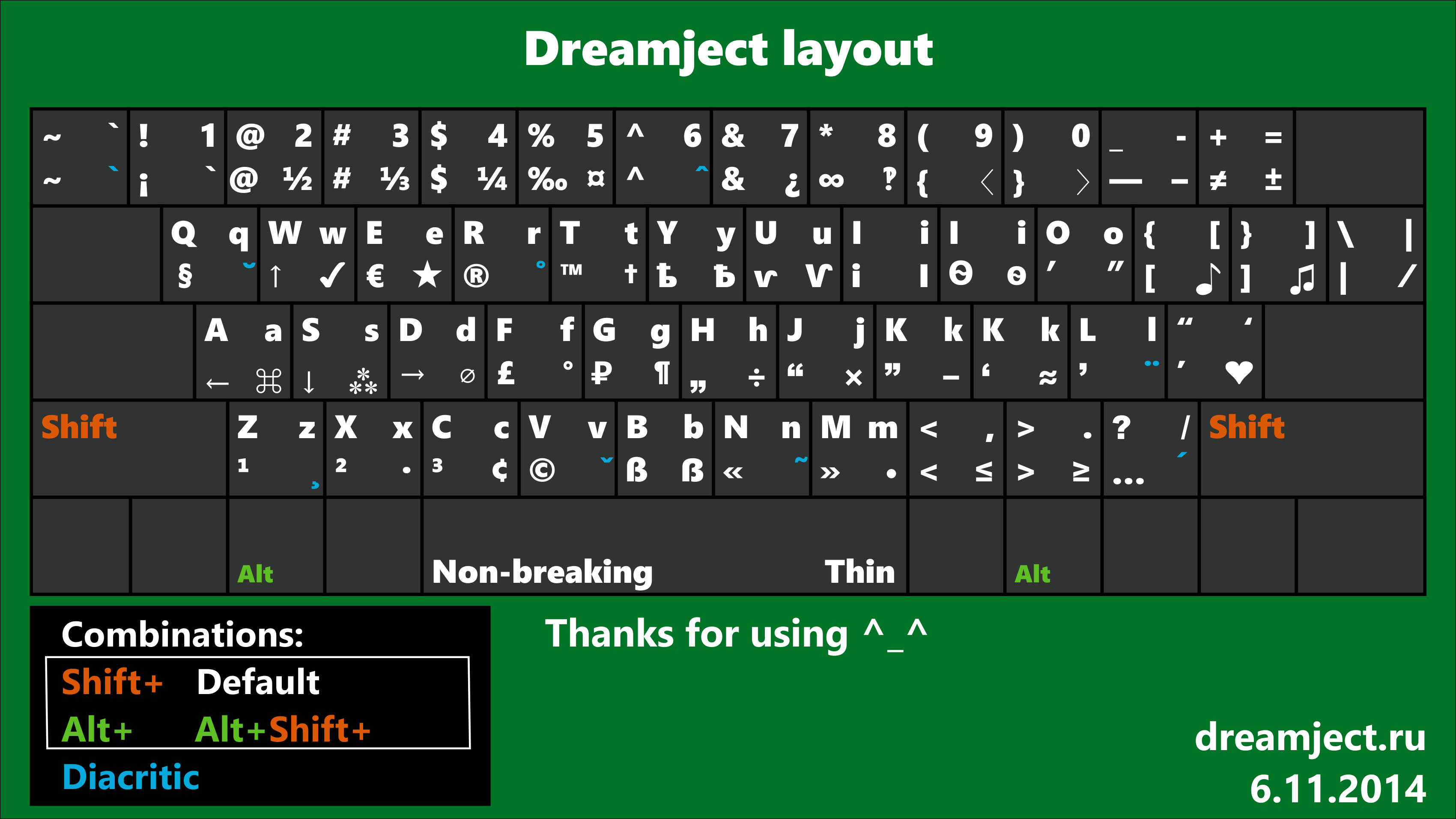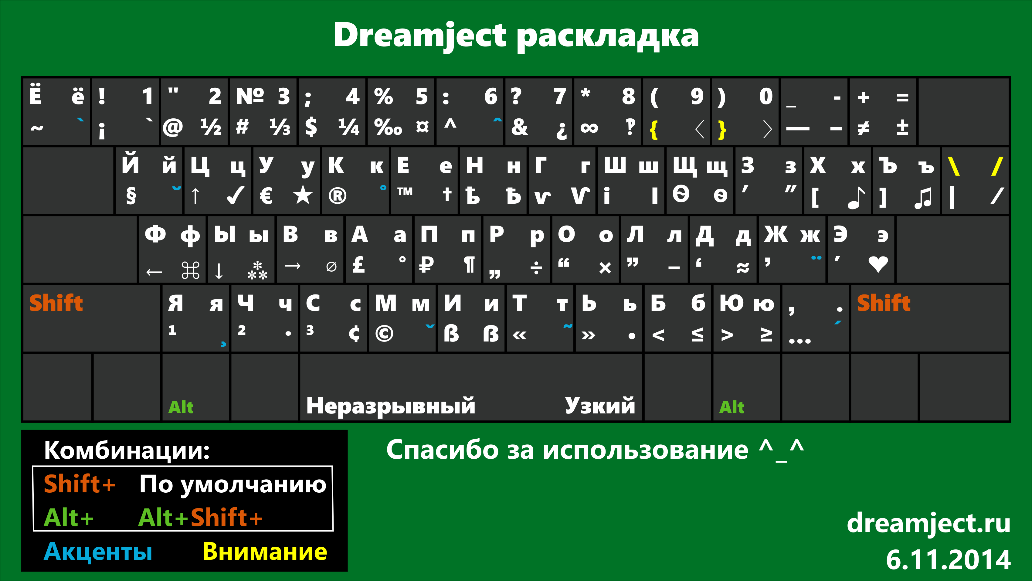 5. Детальная схема для каждой раскладки. В целом положение символов одно, но везде есть свои нюансы