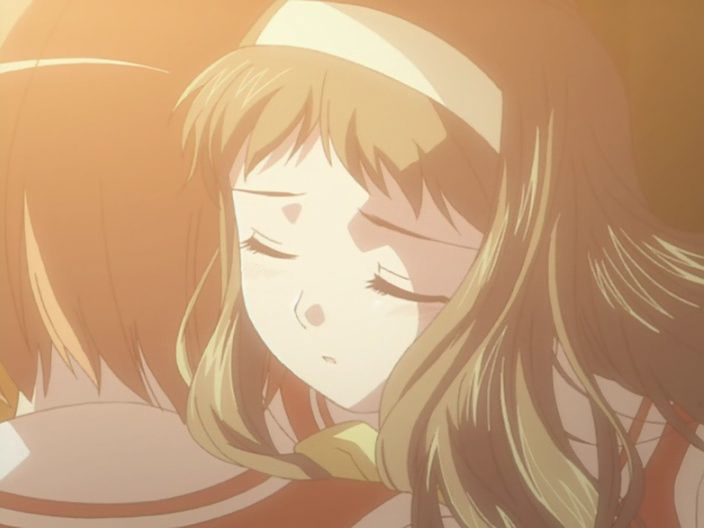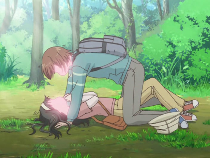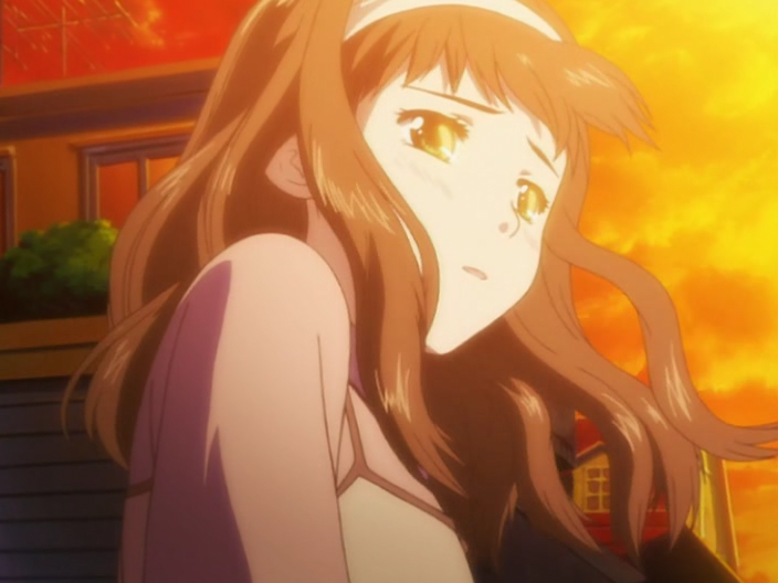 Да, кстати, чуть не забыл, как же это все нарисовано. Ну, что тут сказать, как для сериала, рассчитанного на молодежную аудиторию, нарисовано все стандартно. Можно взять какое-нибудь другое известное аниме и от него отталкиваться (предлагаю оттолкнуться от «Жаркого лета»). Итак, по сравнению с нашим «эталоном» детализация персонажей немного меньше, а задники, хоть и прорисованы достаточно неплохо, но слегка размыты, чтобы не оттягивать внимание зрителя, который должен непрерывно сопереживать главным героям. А у тех, как и подобает жанру, большие ясные глаза, отблескивающие волосы и так далее по списку. Да, а еще очень ярко изображаются гнев, страх, в общем, в ход идет усиление эмоций с помощью гипербол (инженер Гарин здесь не замешан), что делает картину только лучше.