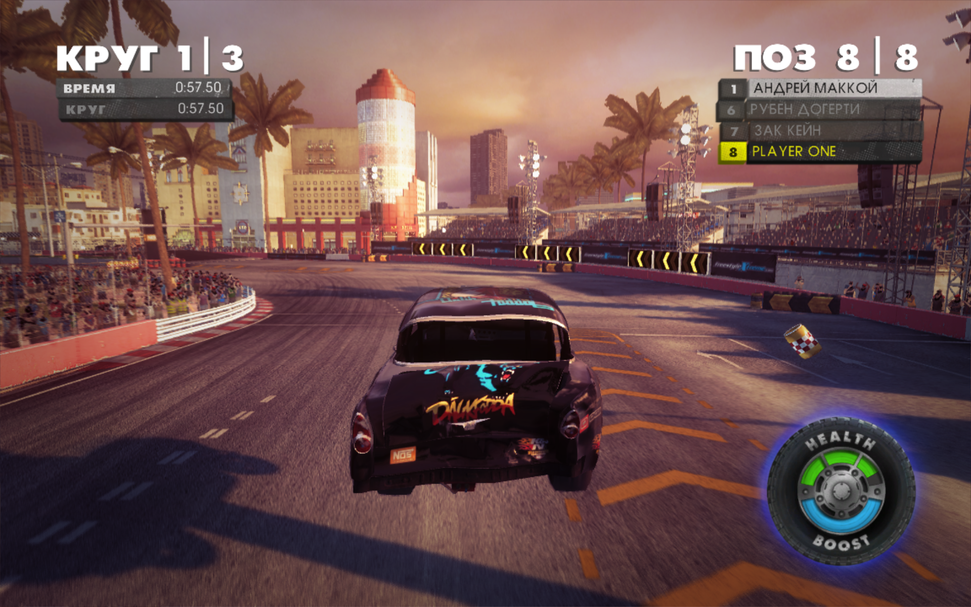 Подчас залогом победы является не столько быстрый и правильный заезд, сколько умение расправляться со своим соперником. Что может быть лучше старого доброго тарана, или хитрого, и при этом коварного зажимания противника к стене с последующим выпихиванием того за пределы трассы? Конечно, этому нужно учиться, но, как уже говорилось, управление в DiRT: Showdown интуитивно понятно и усваивается игроком с первых же минут.