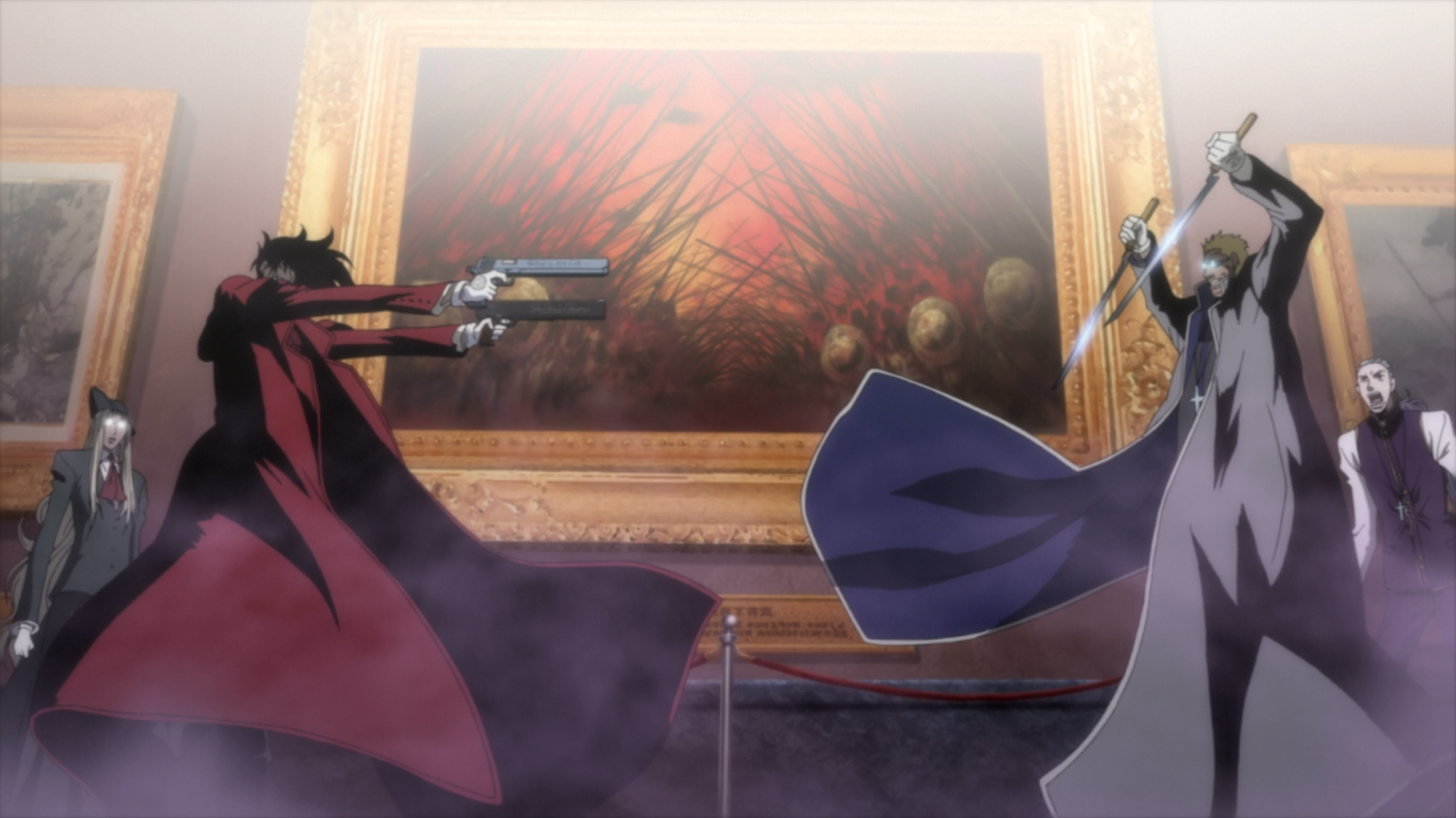 Но кавая почти и нет – да и зачем в трэше кавай? Новый «Хеллсинг» ближе к «Вампирам» Карпентера, а местами напоминает классического «Добермана»: отмороженная красота напополам с кровожадными ухмылками, то и дело у кого-нибудь срывает крышу, остальные хладнокровно шагают по трупам. Кровь, которую перестаёшь замечать, компьютерно-трёхмерные виды и ракурсы пуль, затворов и стволов и обязательные штампы-цитаты: срезанная сигара, округлая попка, высовывающаяся из вентиляции, медленно падающий бокал и красное пятнышко на рукаве белоснежного плаща раздосадованного Люка Валентайна. И белые перчатки – любимая фенечка Хирано.