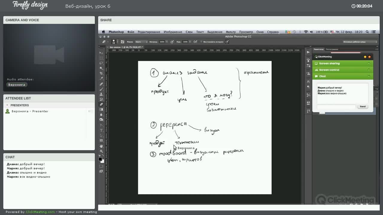 Автор (режиссер): Вероника Полякова Производство: Россия, Онлайн-школа дизайна Firefly Design Жанр: Веб-дизайн Продолжительность: 13:02:08 Качество видео: PCRec Видеокодек: AVC Битрейт видео: ~68,6 - 1105 kb/s Размер кадра: 1280х720, 1920х1080 Аудиокодек: AAC 2.0 Битрейт аудио: 108 kb/s (CBR), 2 Ch, 44100 - 48000 Hz Описание:Курс «Веб-дизайн» подробно освящает тему создания профессионального дизайна сайтов. Цель данного курса — научить студентов создавать по-настоящему эффективные, современные и стильные сайты. Курс отражает новейшие тренды в веб-дизайне, предоставляет студентам мощный инструментарий для дальнейшего развития и профессионального роста в этой области. Предназначен для графических дизайнеров, веб-дизайнеров, специалистов с базовым уровнем владения Photoshop и Illustrator и всех, кто занимается заказом и исполнением заказов на дизайн сайтов. Урок 1. Основные понятия.