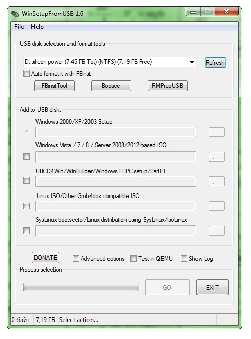 На этом этапе вы запишите (разумеется, с помощью этой программы) на вашу подготовленную флеш-карту ваши специальным образом изменённые инсталляционные файлы Windows. - Запустите WinSetupFromUSB.