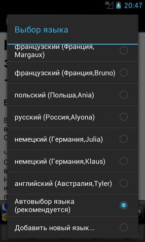 Автоматическое распознавание языка статьи и использование соответствующего голоса TTS, если таковой имеется, либо принудительный выбор предпочтительных голосов в меню с помощью пункта "Выбор языка".