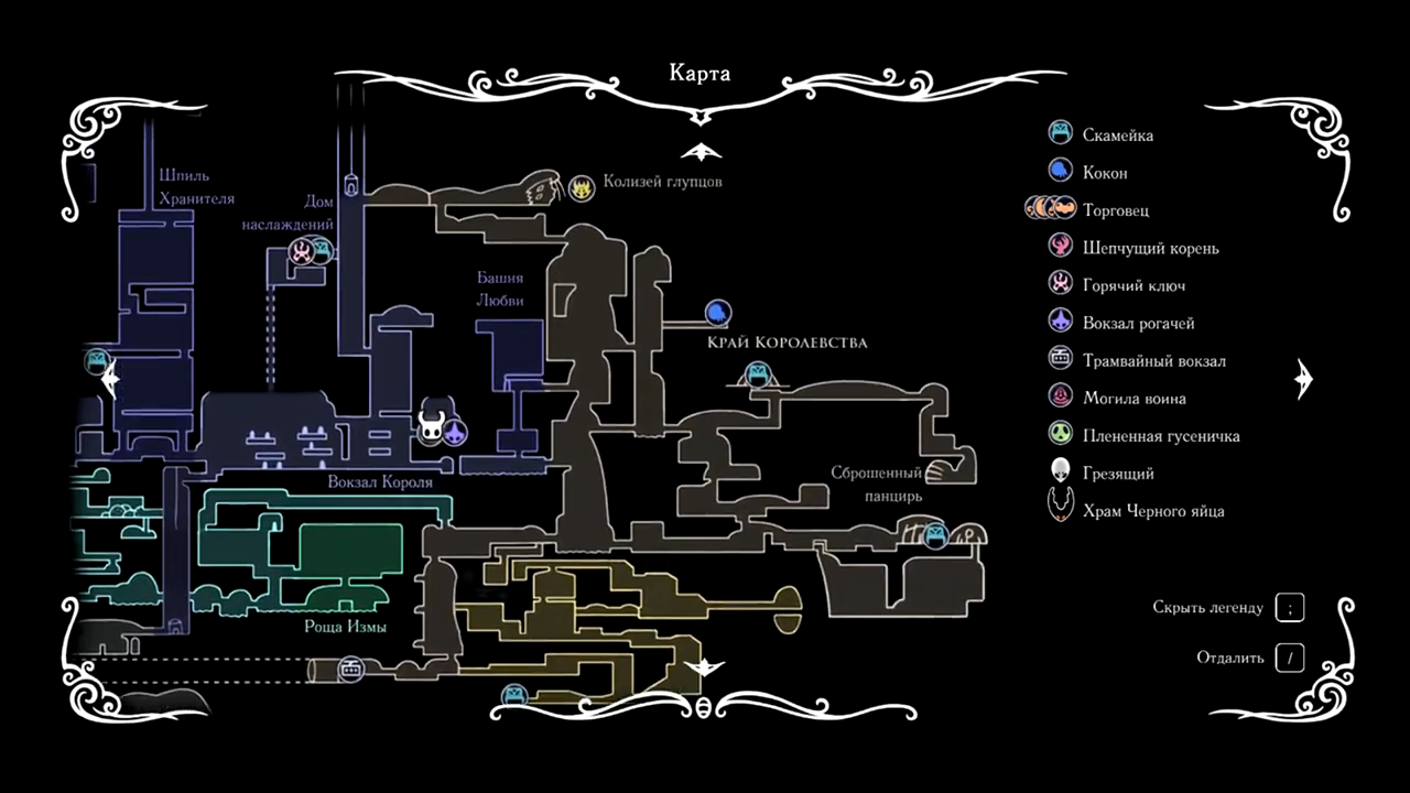 - Прокладывайте маршрут с помощью обширного набора картографических инструментов. Покупка компаса, пера, карт и булавок поможет вам не сбиться с пути в извилистом ландшафте игры Hollow Knight.