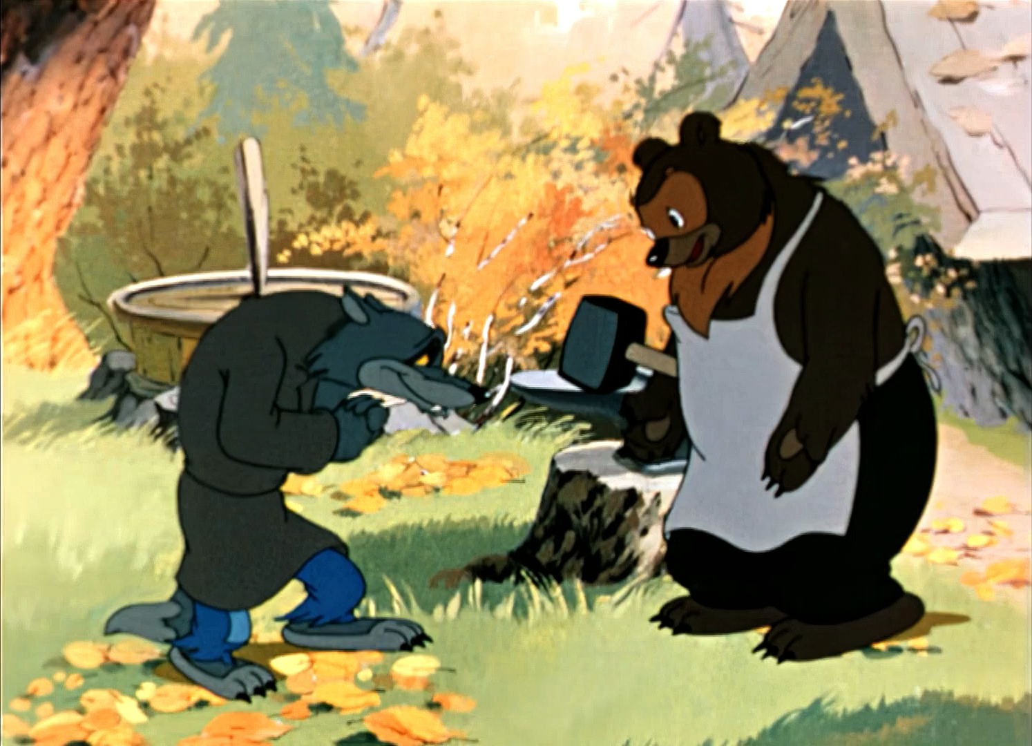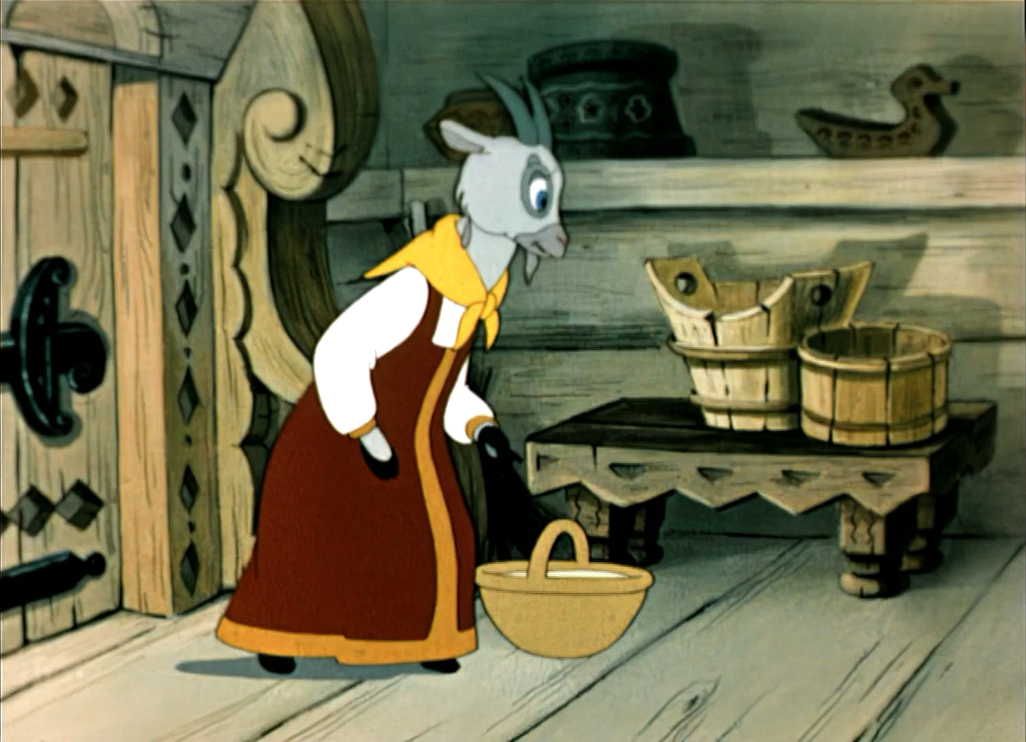 Описание: Однажды голодный Волк услыхал, как Коза спела своим козлятам песенку и они открыли ей дверь. После ухода мамы Козы Волк подобрался к домику и запел ту же песенку. Но козлята, услыхав грубый голос Волка, не пустили его в дом. Тогда Волк пошёл к Медведю-кузнецу. Искусный мастер выковал серому разбойнику тоненький голосок. На этот раз хитрость удалась: Волк проник в дом, забрал всех козлят в мешок и унёс их...