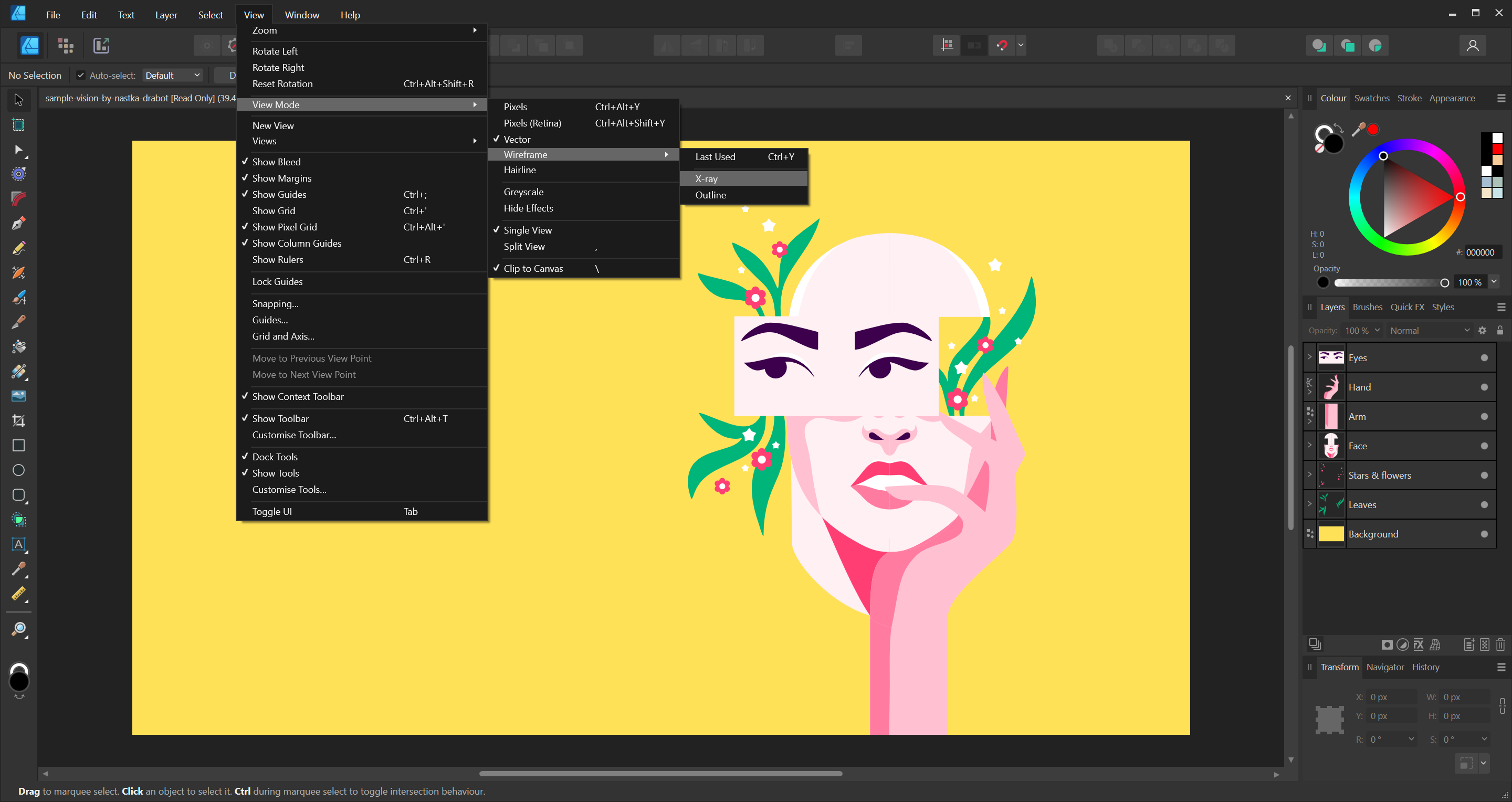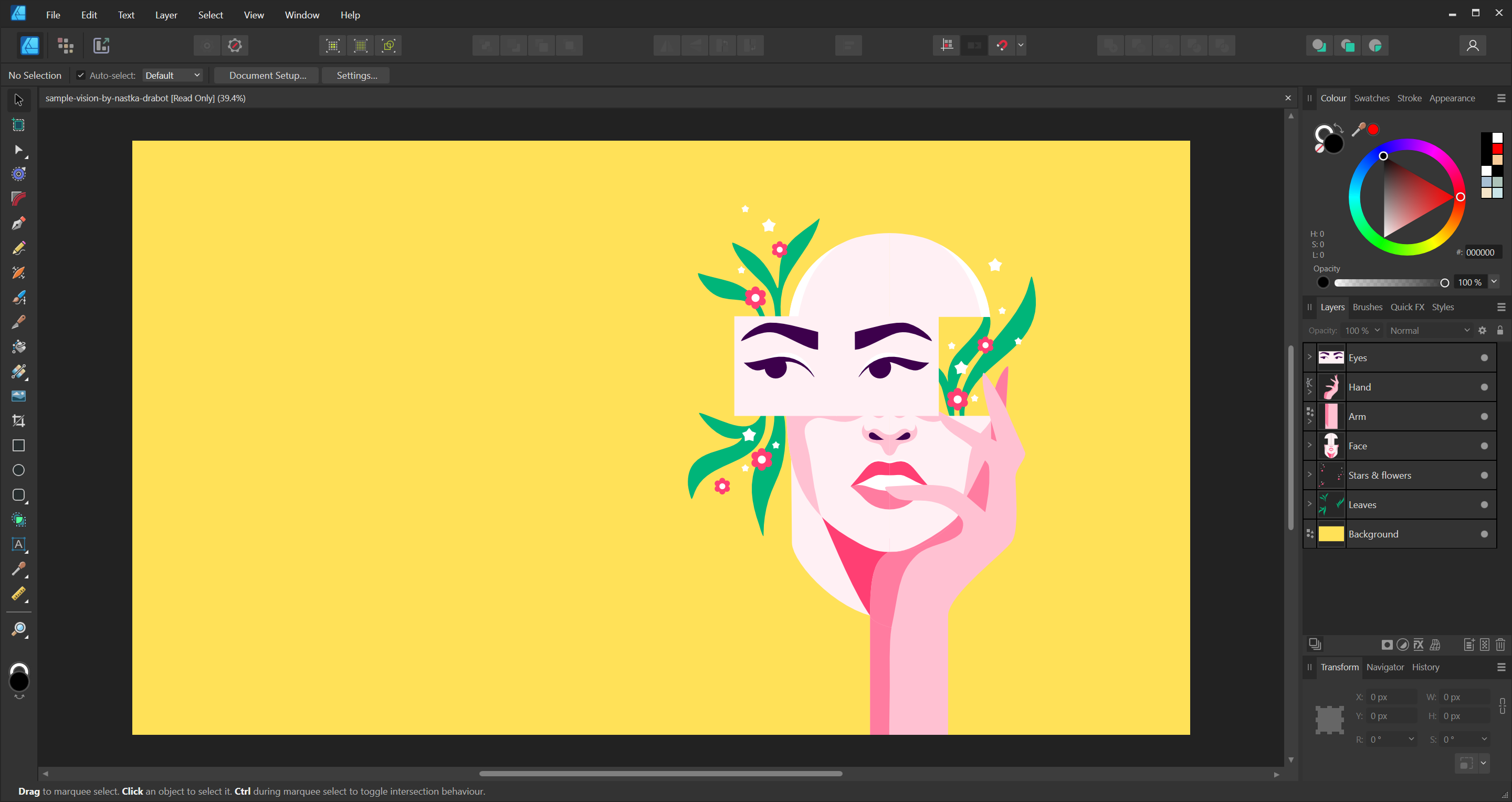Одним из наиболее важных аспектов Affinity Designer является возможность мгновенно переключаться на работу с пикселями. Рисуйте с помощью растровой кисти для того, чтобы добавлять текстуры, накладывать маски, делать пиксельные выделения и даже добавлять слои неразрушающих корректировок. Все без необходимости закрывать приложение.