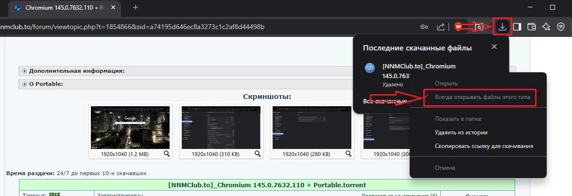 Скачиваешь торрент-файл, затем находишь на панели значок Скачанные файлы → Жмёшь на него. Находишь торрент-файл → ПКМ → Всегда открывать файлы этого типа.