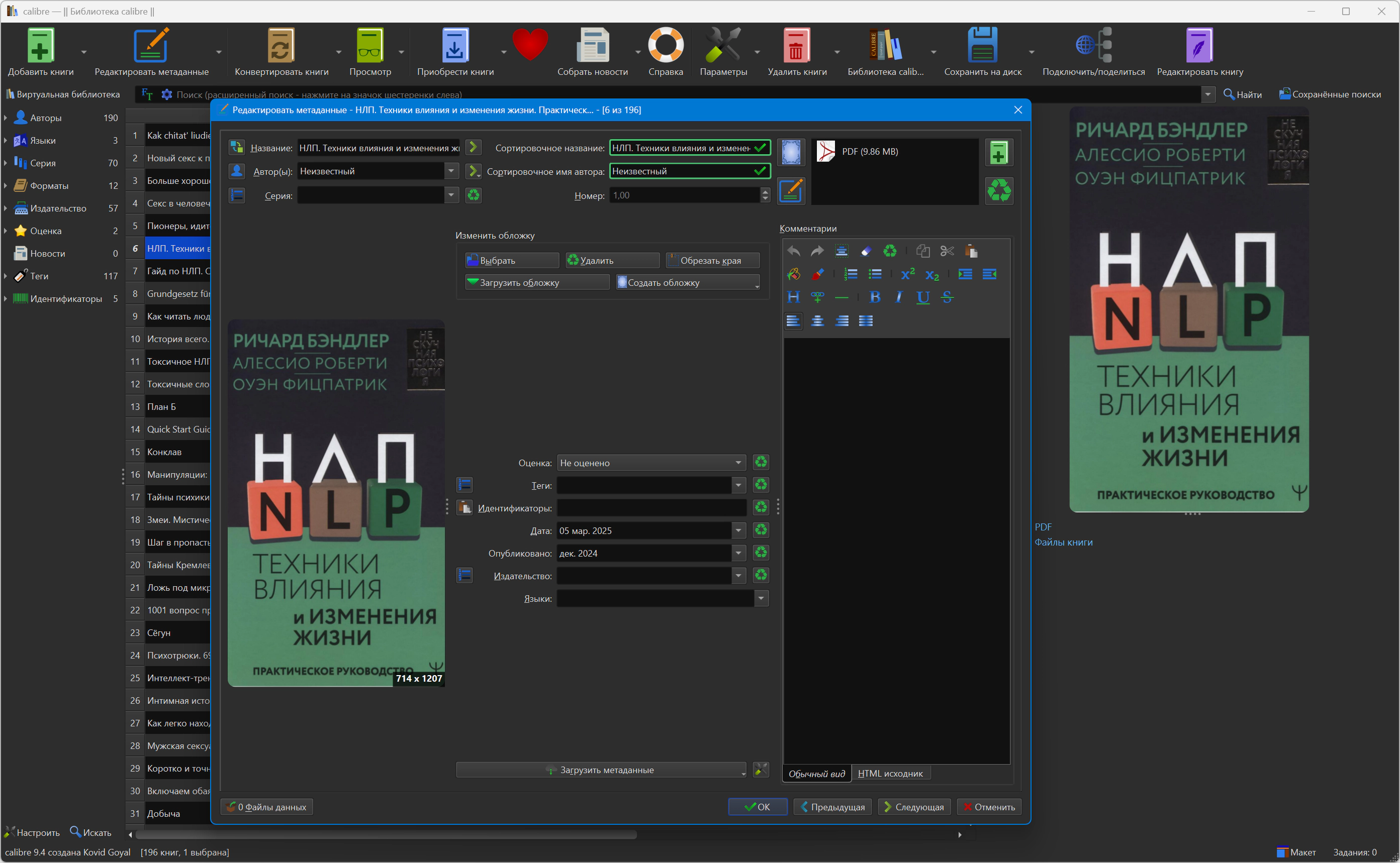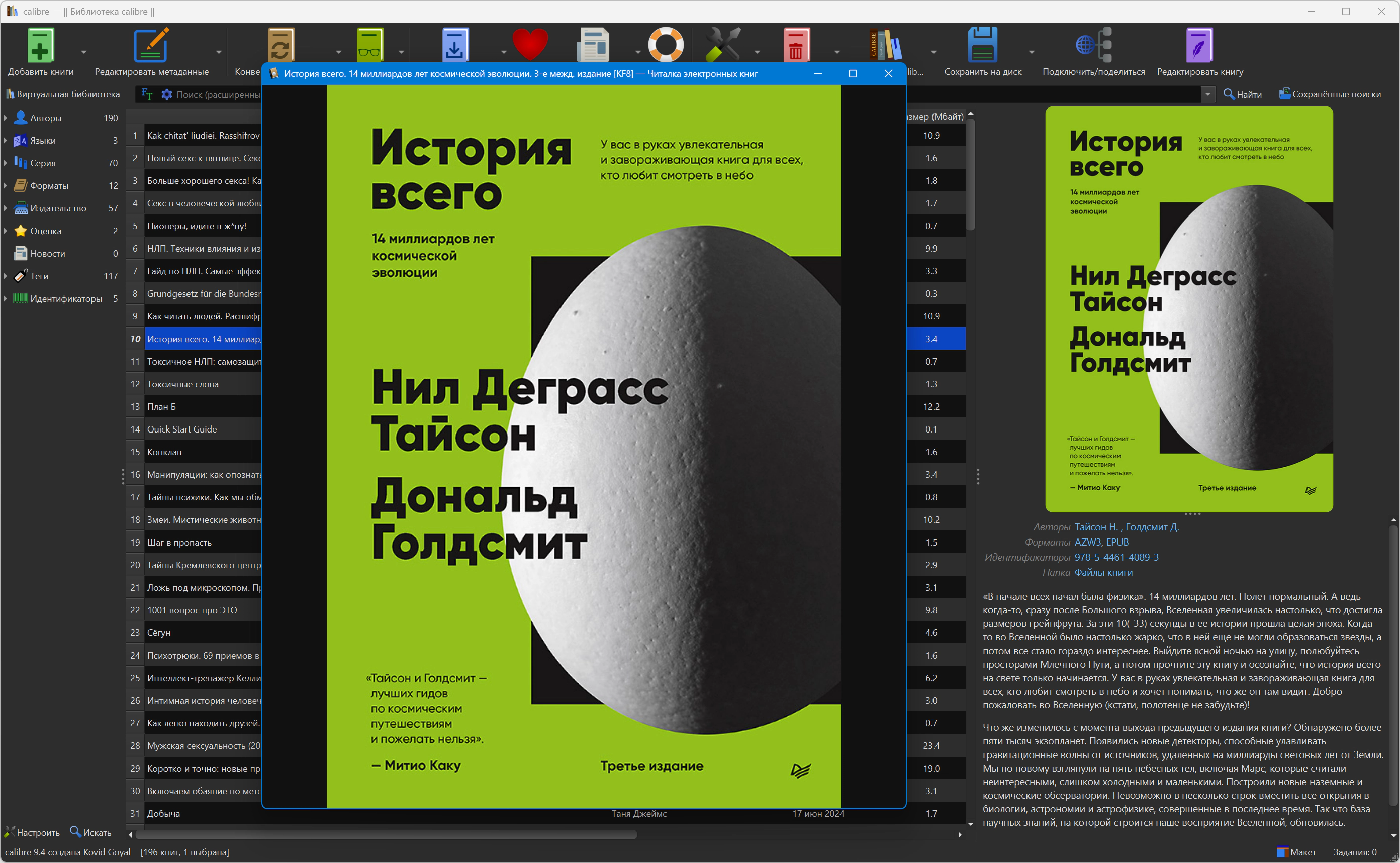 Версия программы: 9.4.0 Официальный сайт: Kovid GoyalЯзык интерфейса: Русский, Английский и другие Лечение: не требуется Системные требования: Описание:Calibre - простая и удобная программа для управления библиотекой и универсальный конвертер электронных книг с большим количеством возможностей. Программа поможет упорядочить вашу библиотеку книг без особых трудностей. Также в её состав входят: утилита для преобразования одного формата в другой, интегратор новостей, программа для синхронизации данных с электронным устройством для чтения и хороший просмотрщик. Она просто необходима поклонникам чтения книг на переносных мобильных устройствах. - Управление библиотекой