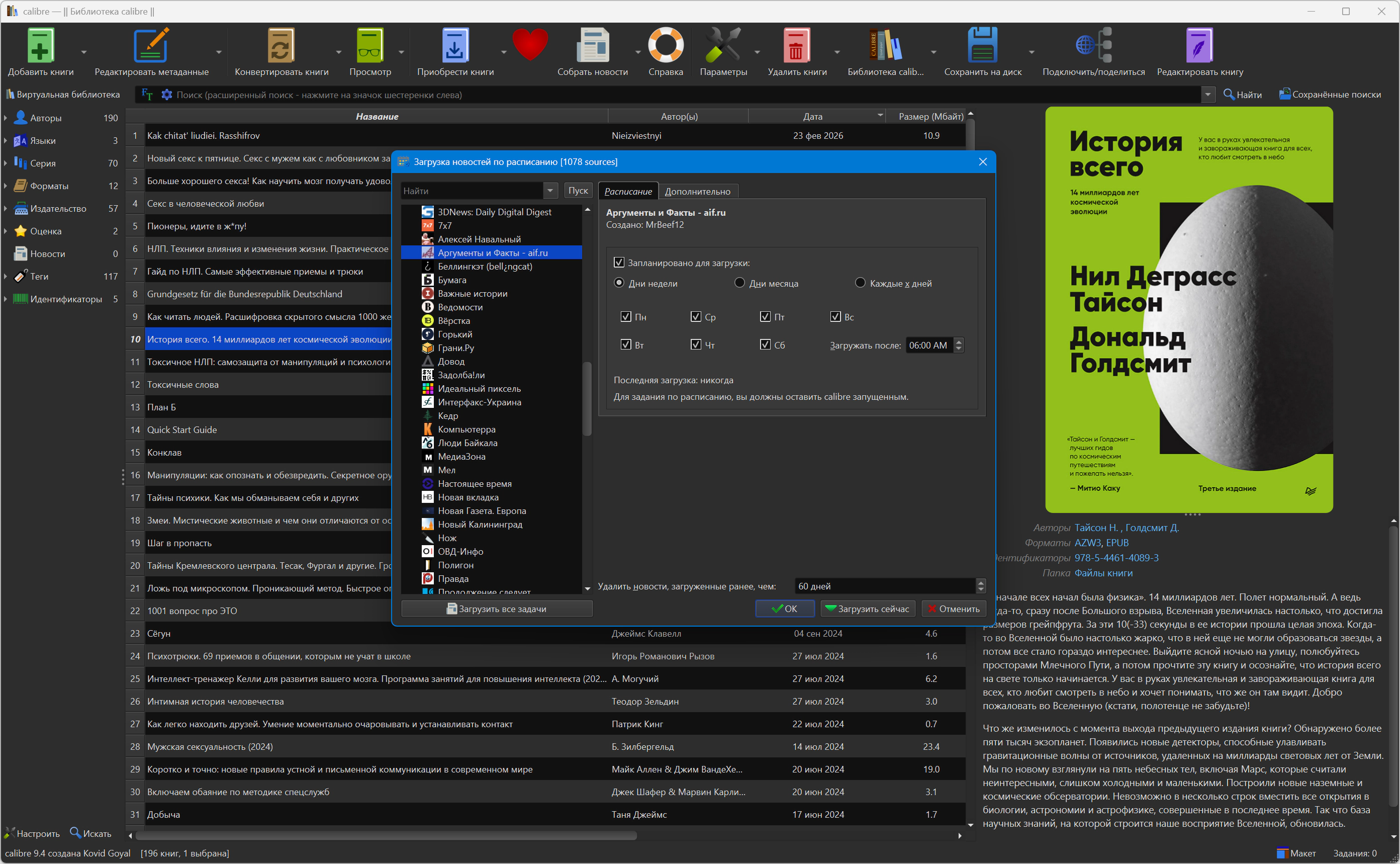 Calibre использует модульную систему драйверов для ридеров, которая позволяет добавлять новые устройства. Программа поддерживает множество устройств. При синхронизации Calibre сама выбирает наиболее подходящий формат или если нет нужного — конвертирует в требуемый. Также добавляет в ридер все нужные метаданные и информацию о сериях книг. Скачивание новостей и конвертация их в книгу Calibre содержит уже 3 сотни источников новостей. И прочитав мануал, вам не составит труда добавить новые источники