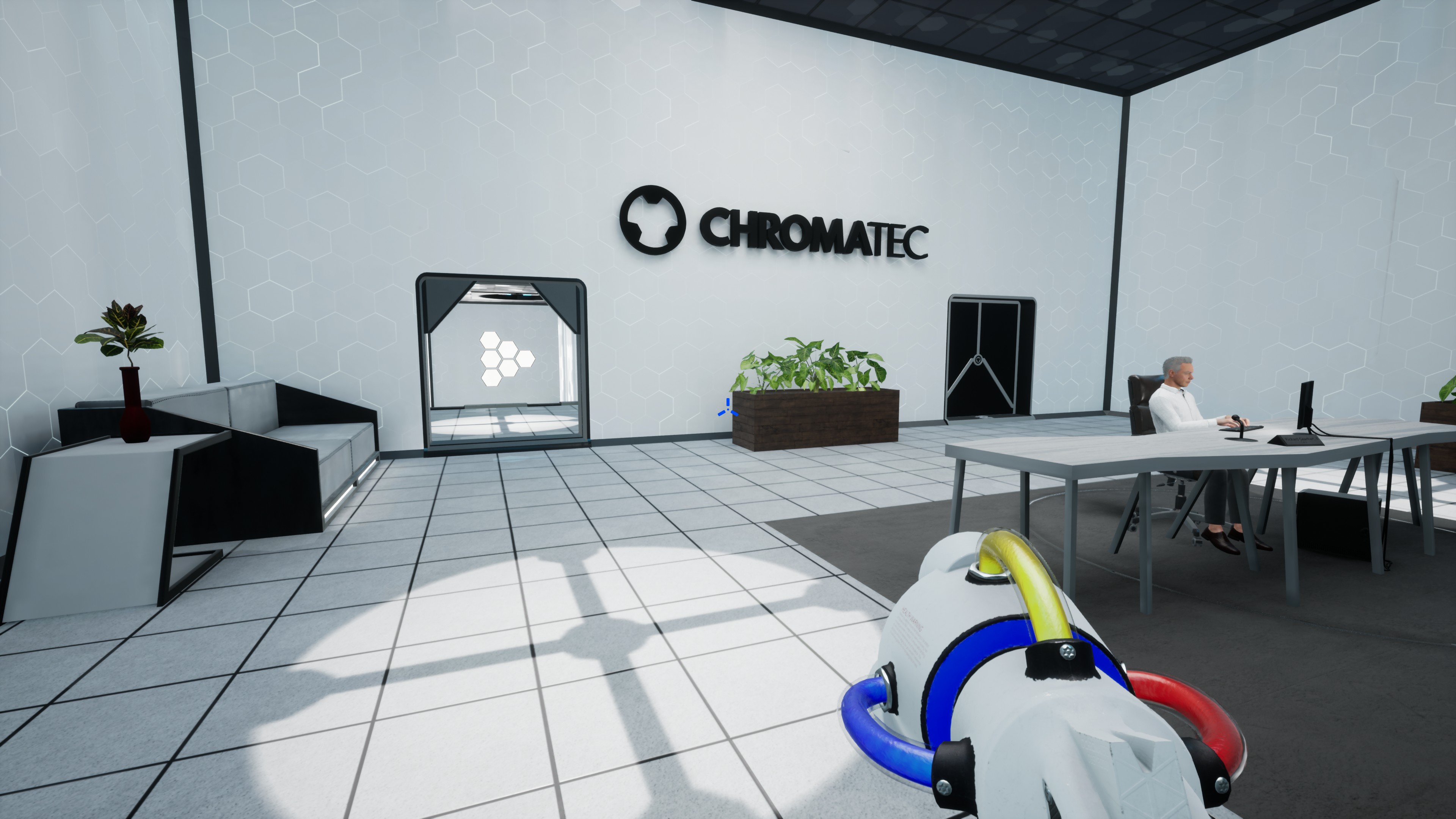 - У нас в ChromaTec цвета - это магниты! Впрочем, не совсем: все немного сложнее. Речь о хроматической магнитности - физическом свойстве всепространственной реальности. Говоря простыми словами, стены притягивают объекты такого же цвета. Какие угодно объекты! Например, большие коробки или маленькие коробки или большие ящики или совершенно безопасных, дружелюбных, крайне безобидных и совсем не смертоносных роботов WorkerDroid*. (Список не исчерпывающий.) *Роботы WorkerDroid могут быть не такими безобидными, как предполагалось.