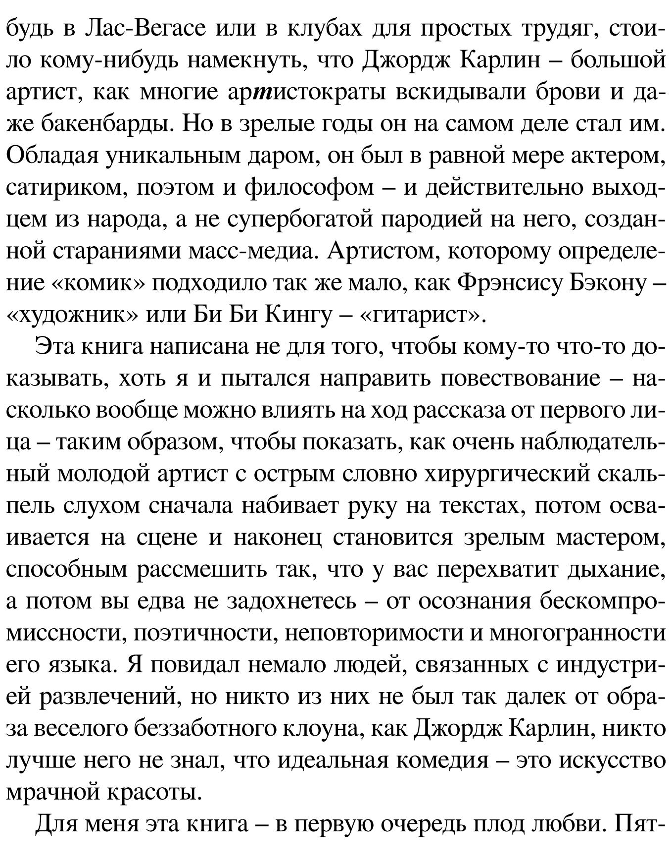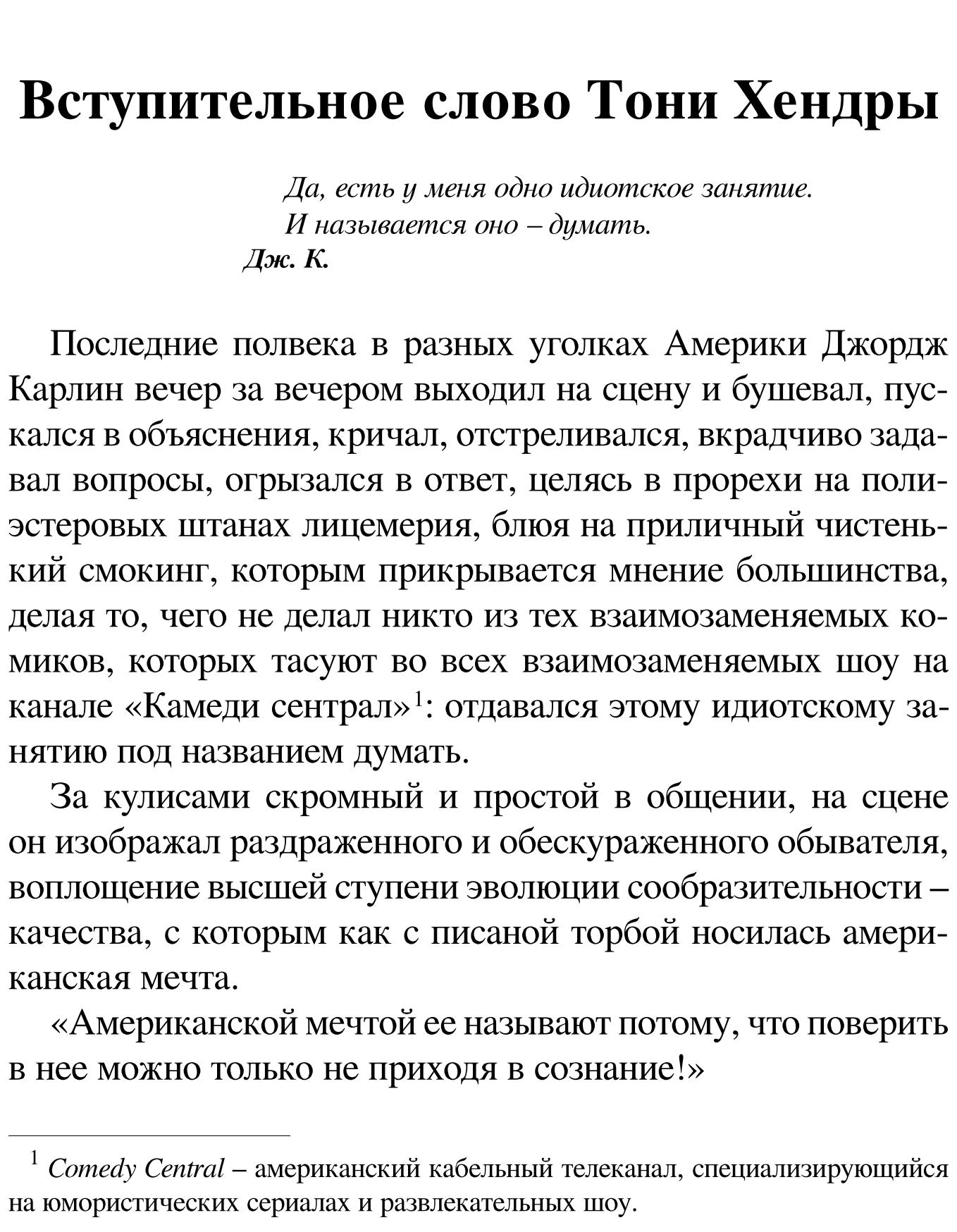 Описание:«Это идиотское занятие – думать» – не просто мемуары известного человека, или, как говорил сам Карлин, – квазибиография, это практическое пособие для любого начинающего комика (как, возможно, не следует жить, но как точно надо шутить). В 1993 году Джордж Карлин попросил своего друга и автора бестселлеров Тони Хендру помочь ему написать автобиографию. В течение почти пятнадцати лет в ходе множества разговоров, многие из которых были записаны, они обсуждали личную жизнь, определенные этапы карьеры и эволюцию Карлина как артиста. Когда в июне 2008 года Карлин умер в возрасте семидесяти одного года, а книга все еще не была опубликована, Хендра решил закончить ее, как того хотел бы его друг.