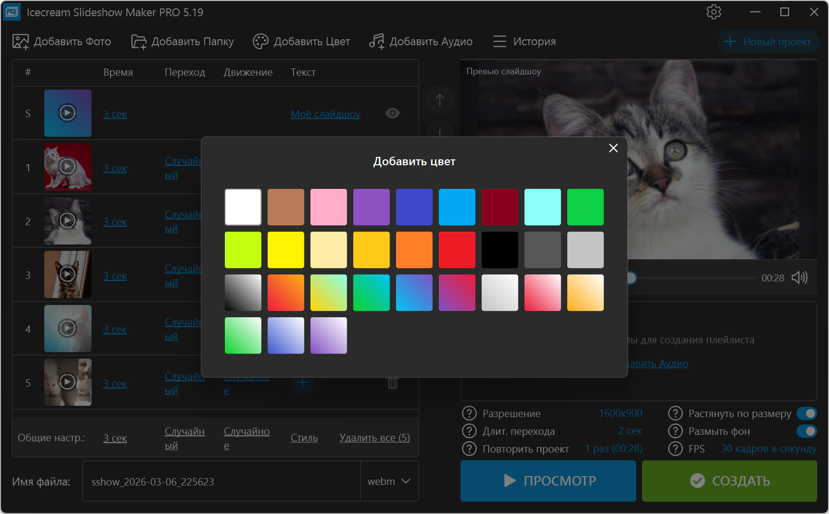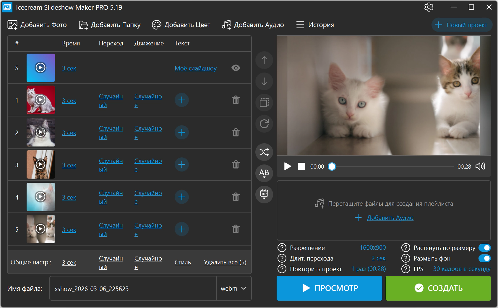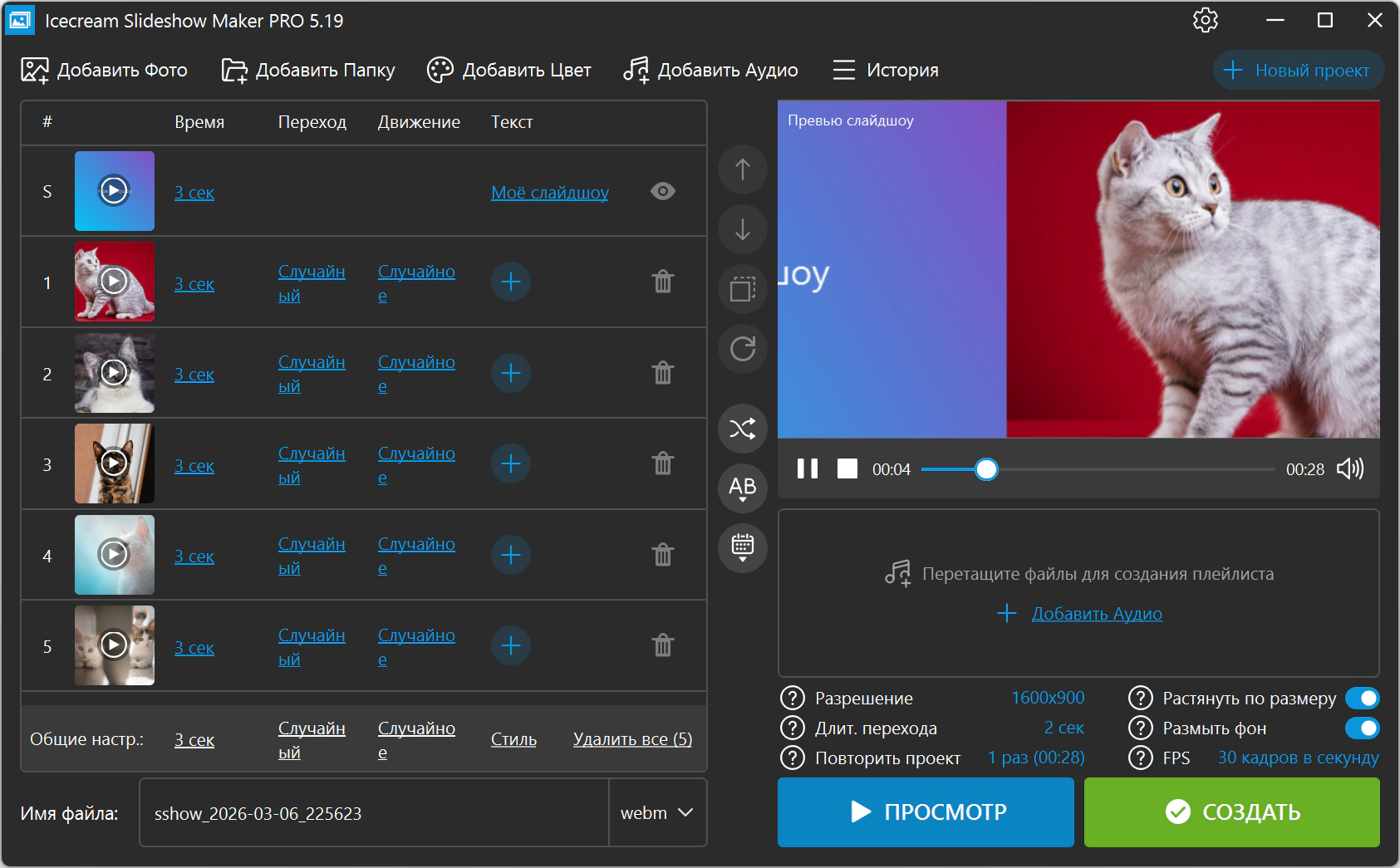 Описание:Icecream Slideshow Maker - это приложение для создания видео слайдшоу на основе ваших любимых фотографий. Оживите свои фото с помощью большого количества эффектов и наложения музыки. Программа не требует специальных навыков и позволяет создать слайдшоу всего за несколько минут: добавьте фото, выставите нужные настройки для каждого кадра, проверьте с помощью предпросмотра и нажмите кнопку "Создать"!