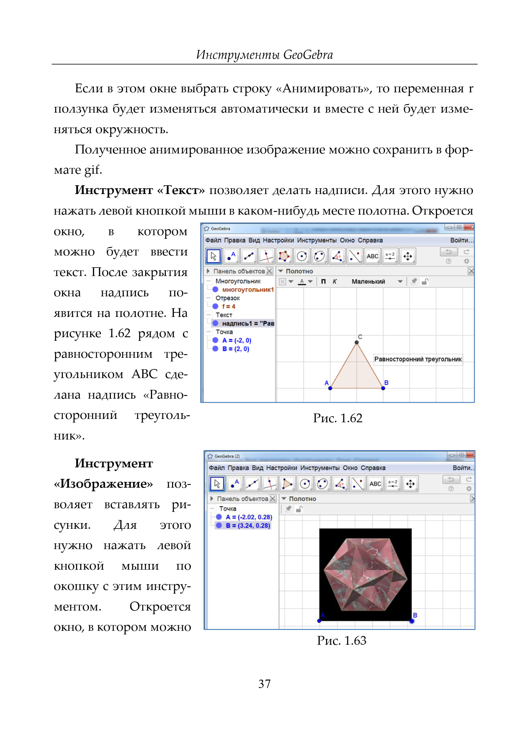 http://geogebra.org. Она позволяет моделировать и решать различные алгебраические и геометрические задачи, строить графики функций, находить наибольшие и наименьшие значения, пределы, производные. интегралы, получать изображения плоских и пространственных фигур, проводить дополнительные построения, создавать анимацию рисунков. Кроме того, эта программа позволяет ставить геометрические опыты, проводить эксперименты, иллюстрировать формулы и теоремы, устанавливать зависимости между геометрическими величинами и мн. др. Здесь мы рассмотрим возможности GeoGebra для использования её в обучении геометрии в школе, предложим задачи для самостоятельного решения. В конце пособия будут даны решения задач. Начнем с планиметрии.