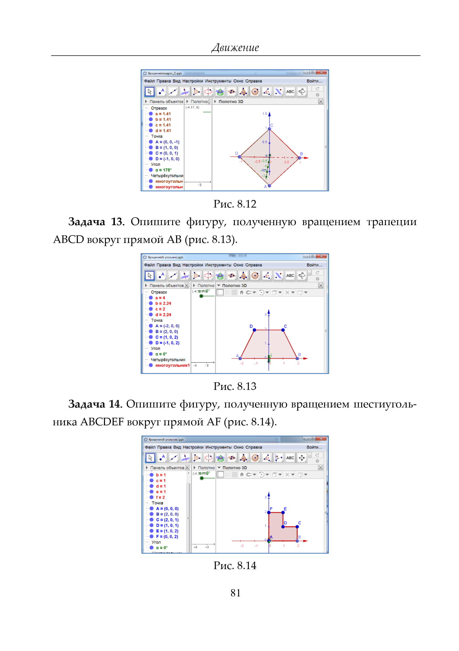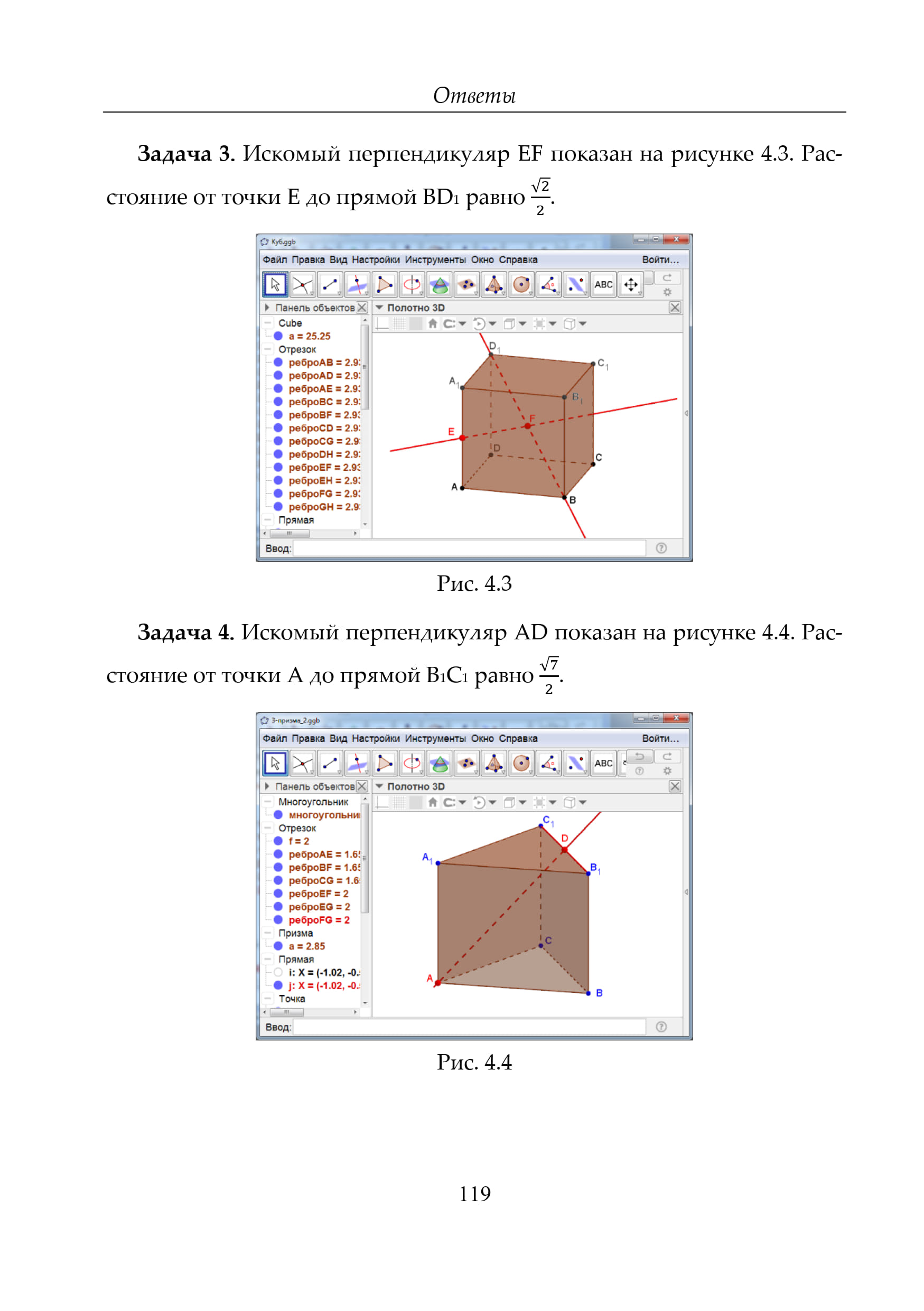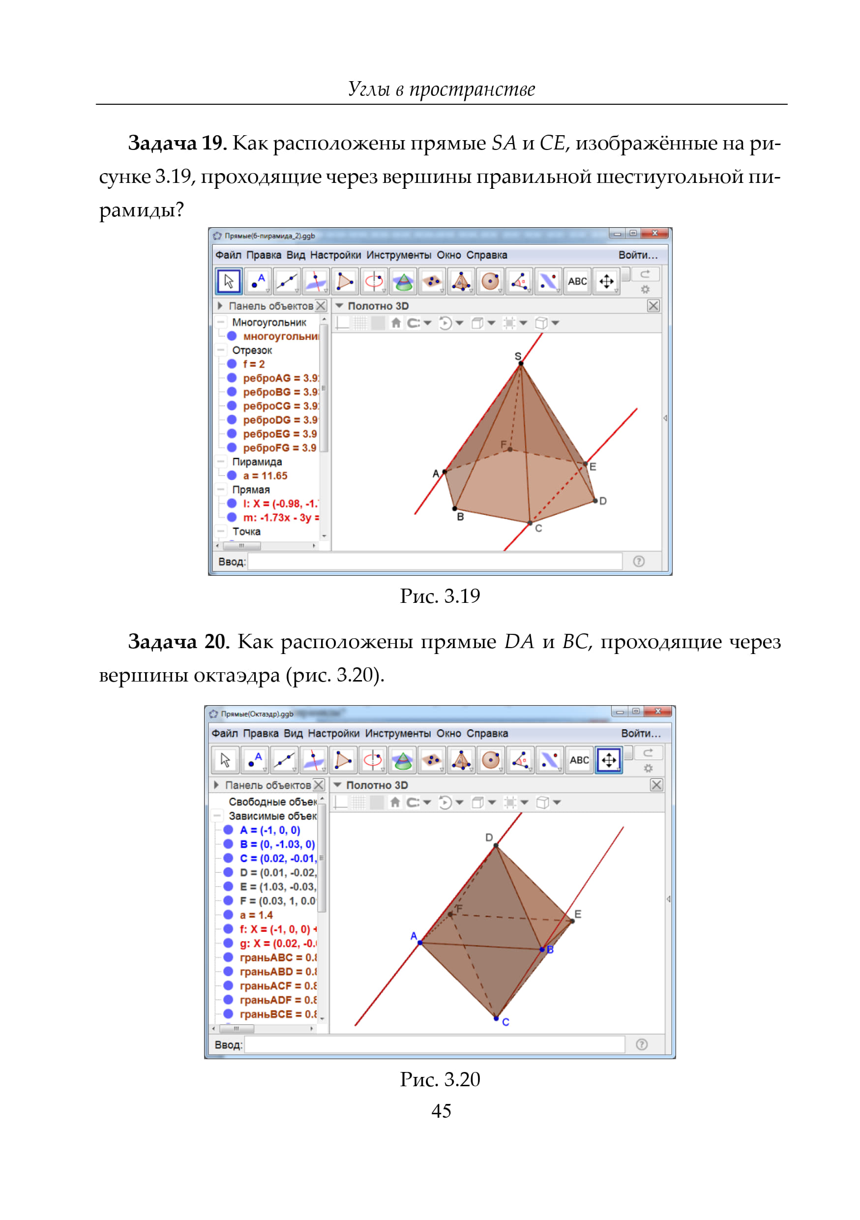 http://geogebra.org. Она позволяет моделировать и решать различные алгебраические и геометрические задачи, строить графики функций, находить наибольшие и наименьшие значения, пределы, производные. интегралы, получать изображения плоских и пространственных фигур, проводить дополнительные построения, создавать анимацию рисунков. Кроме того, эта программа позволяет ставить геометрические опыты, проводить эксперименты, иллюстрировать формулы и теоремы, устанавливать зависимости между геометрическими величинами и мн. др. Здесь мы рассмотрим возможности GeoGebra для использования её в обучении геометрии в пространстве (стереометрии), предложим задачи для самостоятельного решения. В конце пособия будут даны решения задач.