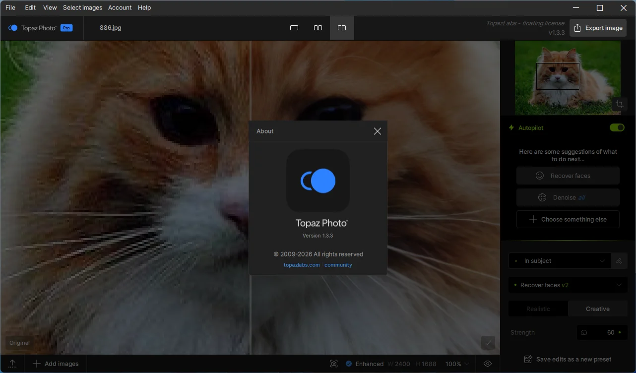 Available Internal Storage: 60+ GB Описание:Topaz Photo - это интеллектуальное программное обеспечение для улучшения изображения, которое позволяет вам заострить детали, восстановить фокус и регулировать уровни на каждом снимке. Выбирайте из 11 инструментов на основе ИИ для совершенствования своих изображений, или начните Вашу работу при установках по умолчанию (Автопилот).