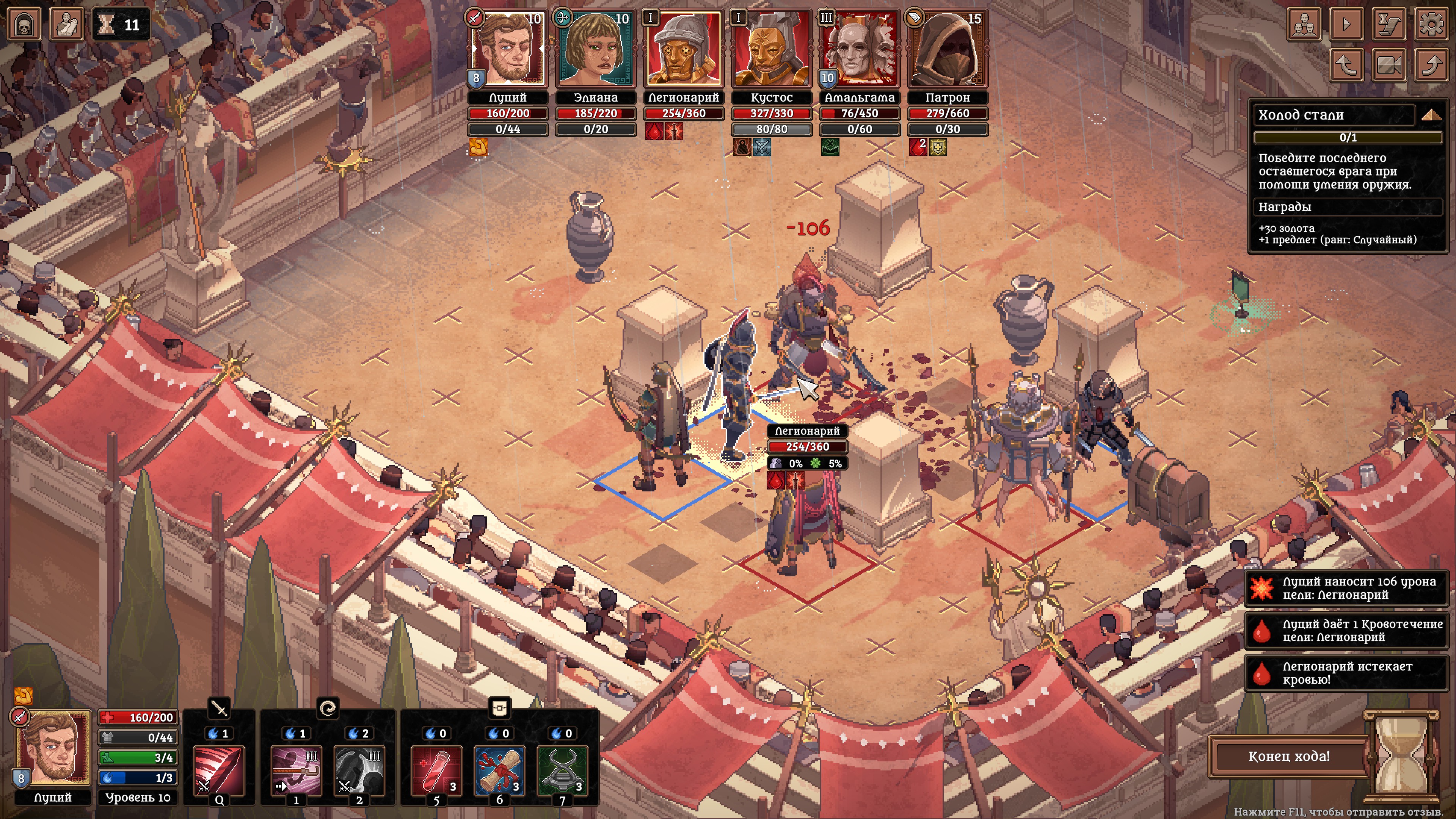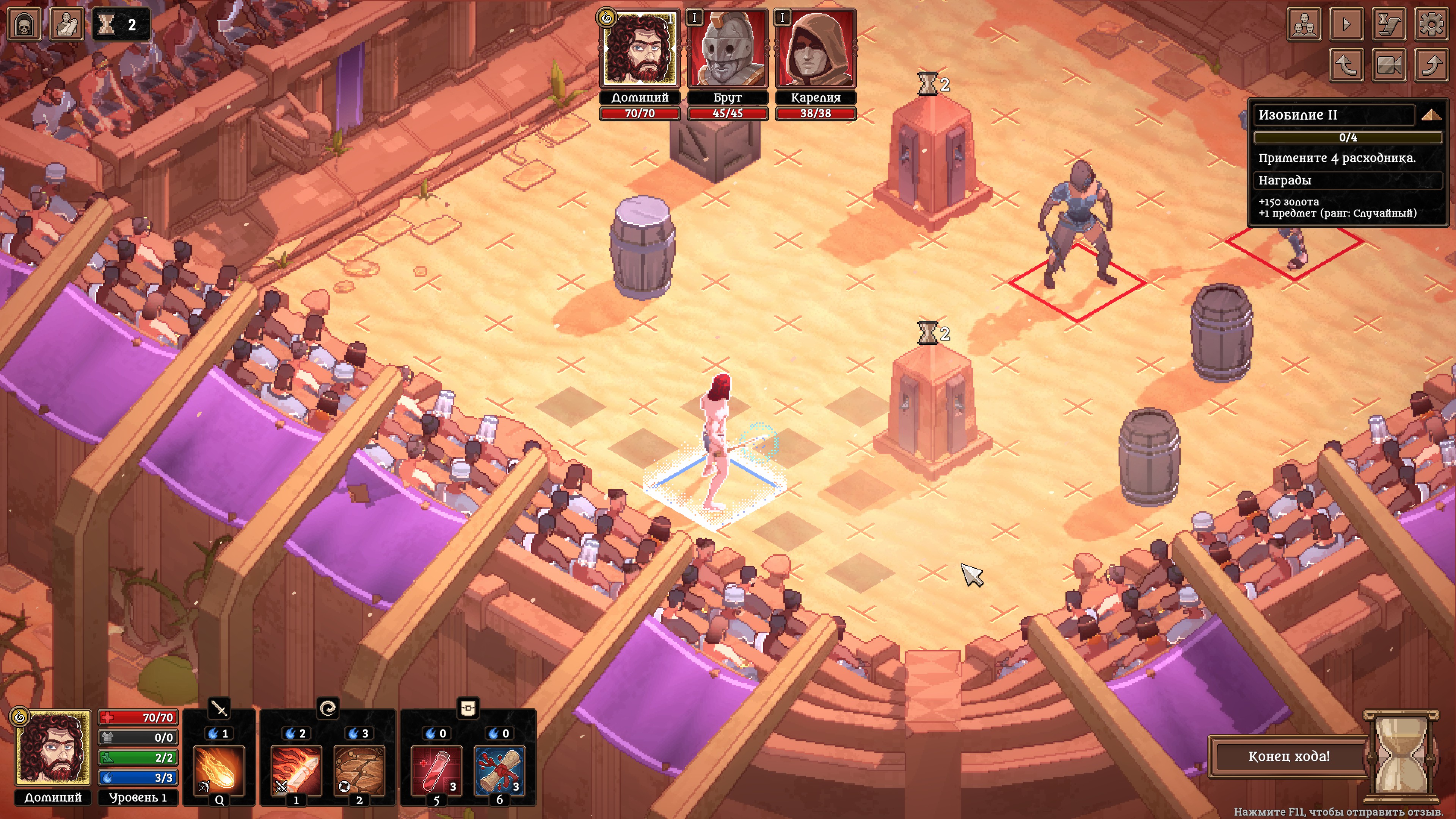 - Битва разворачивается в пошаговом режиме на поле из клеток. Гладиаторы действуют в порядке, определенном их инициативой. Маневрируйте, атакуйте и выбирайте позиции так, чтобы перехитрить и обойти соперников.