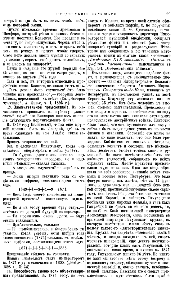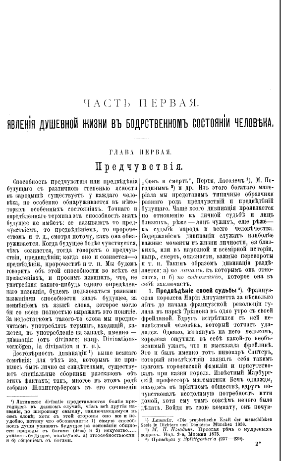 Описание:Мы убеждены, что все, кто интересуется природою и свойствами души человека, у кого не заглохъ вкусъ ко всему духовному, полному неотразимаго интереса, (а такихъ громадное большинство читателей), заинтересуется нашей книгою. Краткое содержанiе книги: Предчувсвiя. -Вещiя виденiя. -Двойничество. -Телепатiя. -Психометрическая способность души. -Животный магнитизмъ. -Духовидцы. -Электрическiе люди. -Левитацiя. -Телекинетiя. -Медiумизмъ. -Вещiе сны. - Сомпамбулизмъ. -Гипнотизмъ. -Кончина людей. -Таинственныя предзнаменованiя кончины людей. -Смерть. -Явления умершихъ. -Мытрства. -Загробная жизнь. -Ходатайство живыхъ за умершихъ. -О спасенiи души. -О воскресенiи мертвыхъ. -Богъ въ природе, душе человека и всемiрной исторiи. -О конечной цели человеческой жизни. -О бытiи ангеловъ. -О бытiи демоновъ. -Непокойные дома. -Духовныя средства борьбы съ демонами.